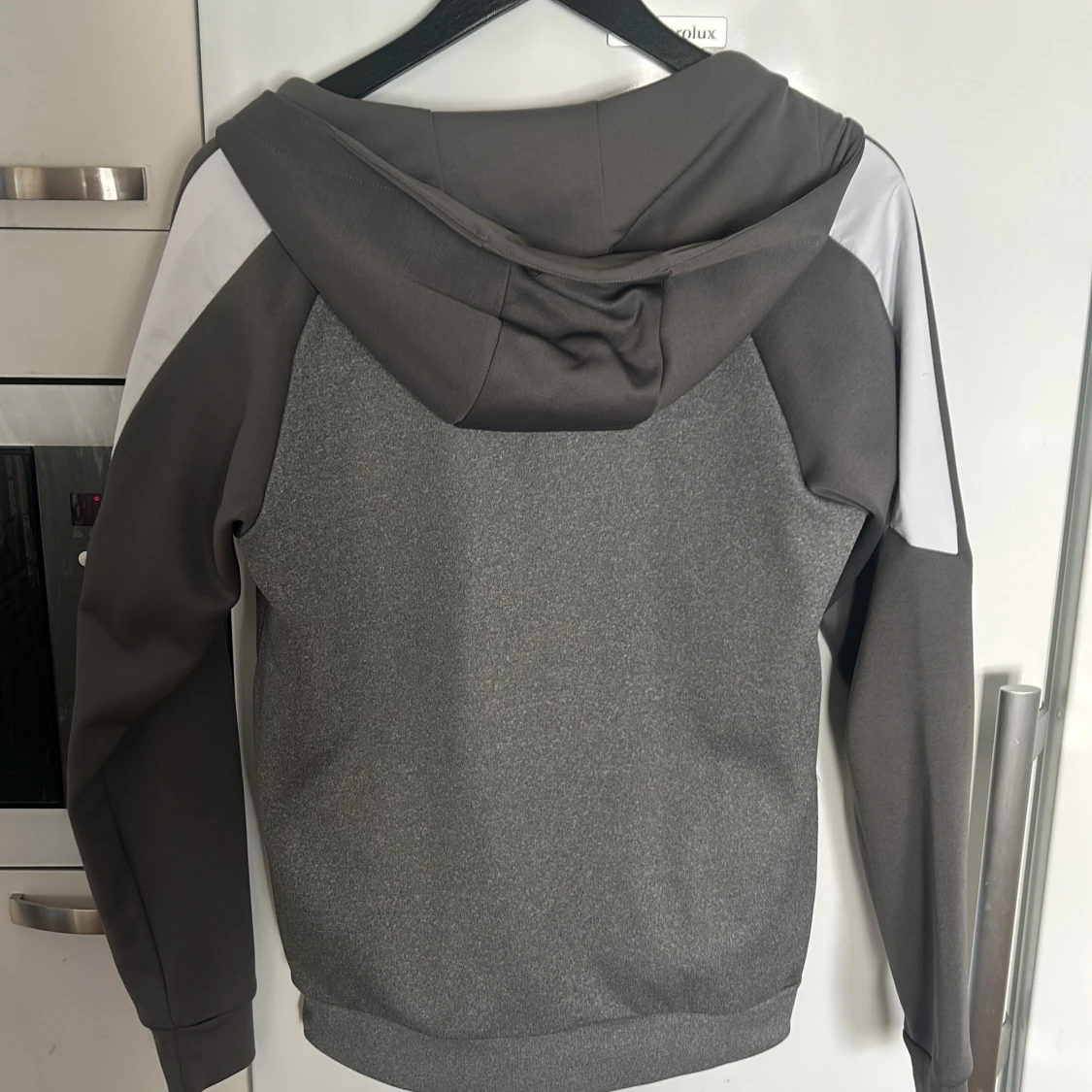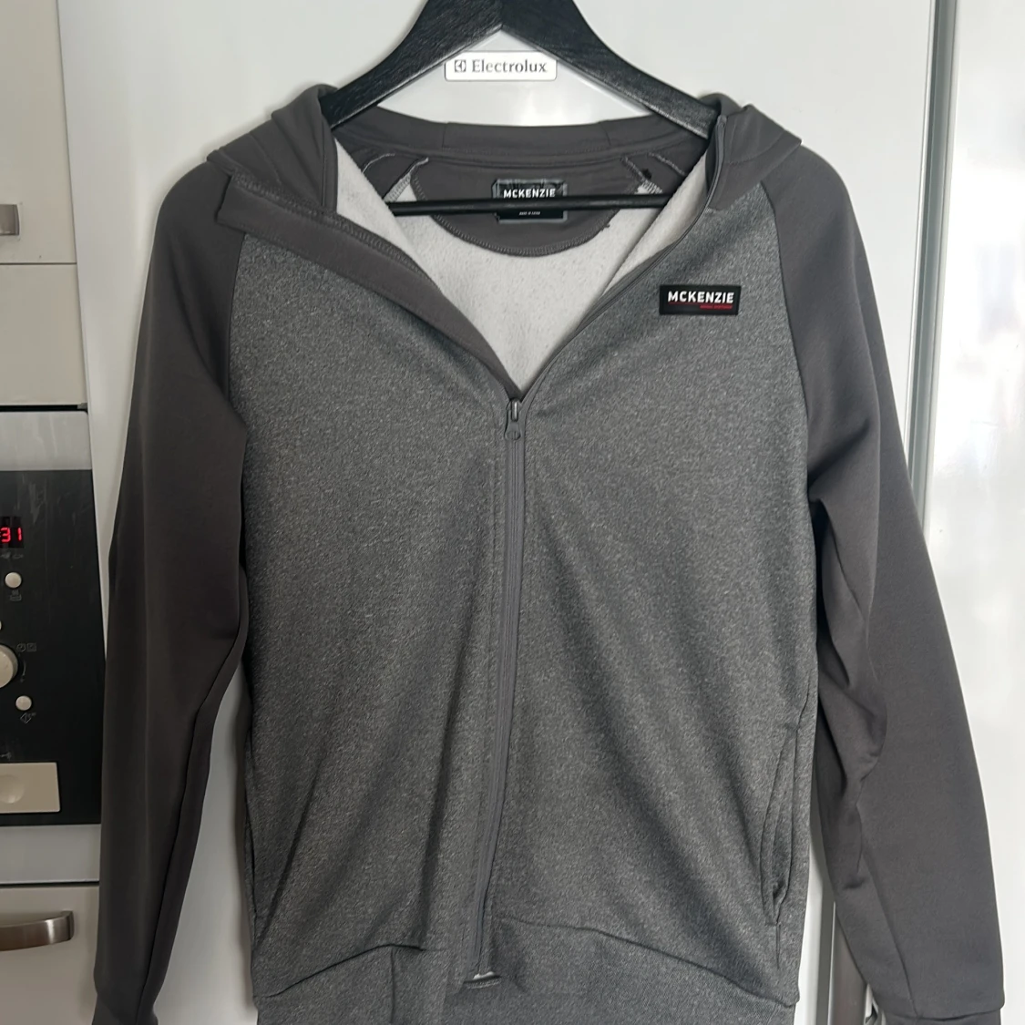 Säljer en grå huvtröja från McKenzie med dragkedja och huva. Tröjan har långa ärmar och en stilren design med vita detaljer på ärmarna. Perfekt för en avslappnad stil. Pris kan diskuteras 👍