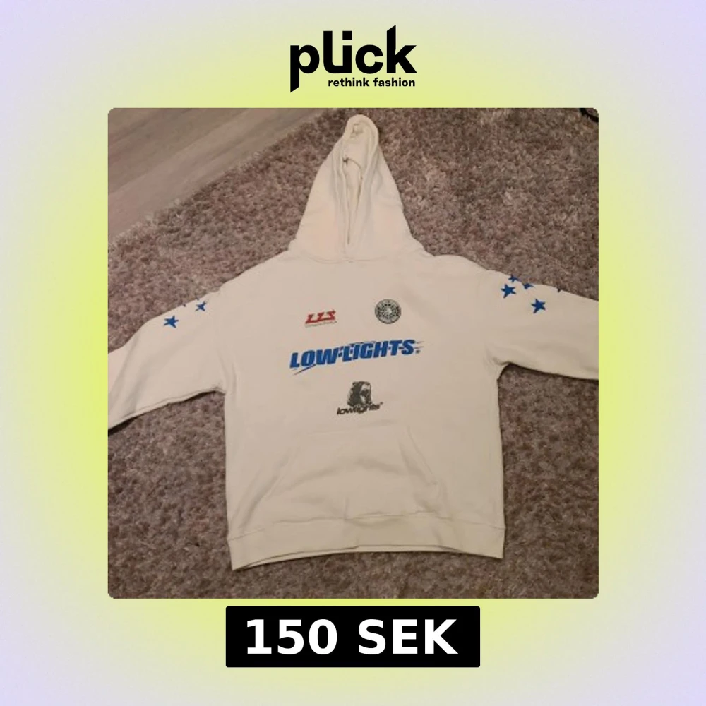Säljer en vit hoodie från Lowlights med blå stjärnor på ärmarna och tryck på framsidan. Hoodien har en klassisk design med en stor ficka framtill och en bekväm huva. Perfekt för en avslappnad stil.
