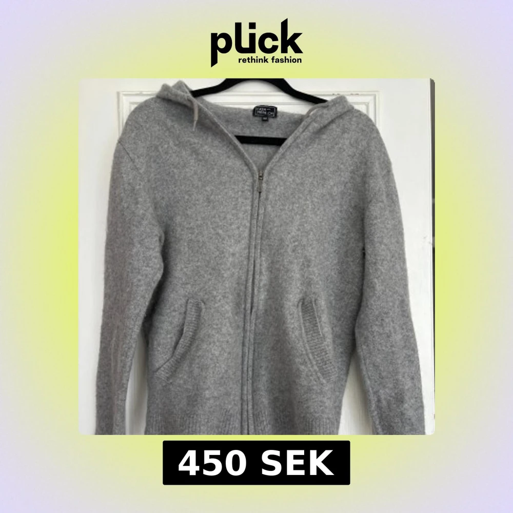 Mysig grå hoodie i kashmir från CASHMERE.CH med dragkedja framtill, huva och två fickor. Tröjan har hål på armbågarna