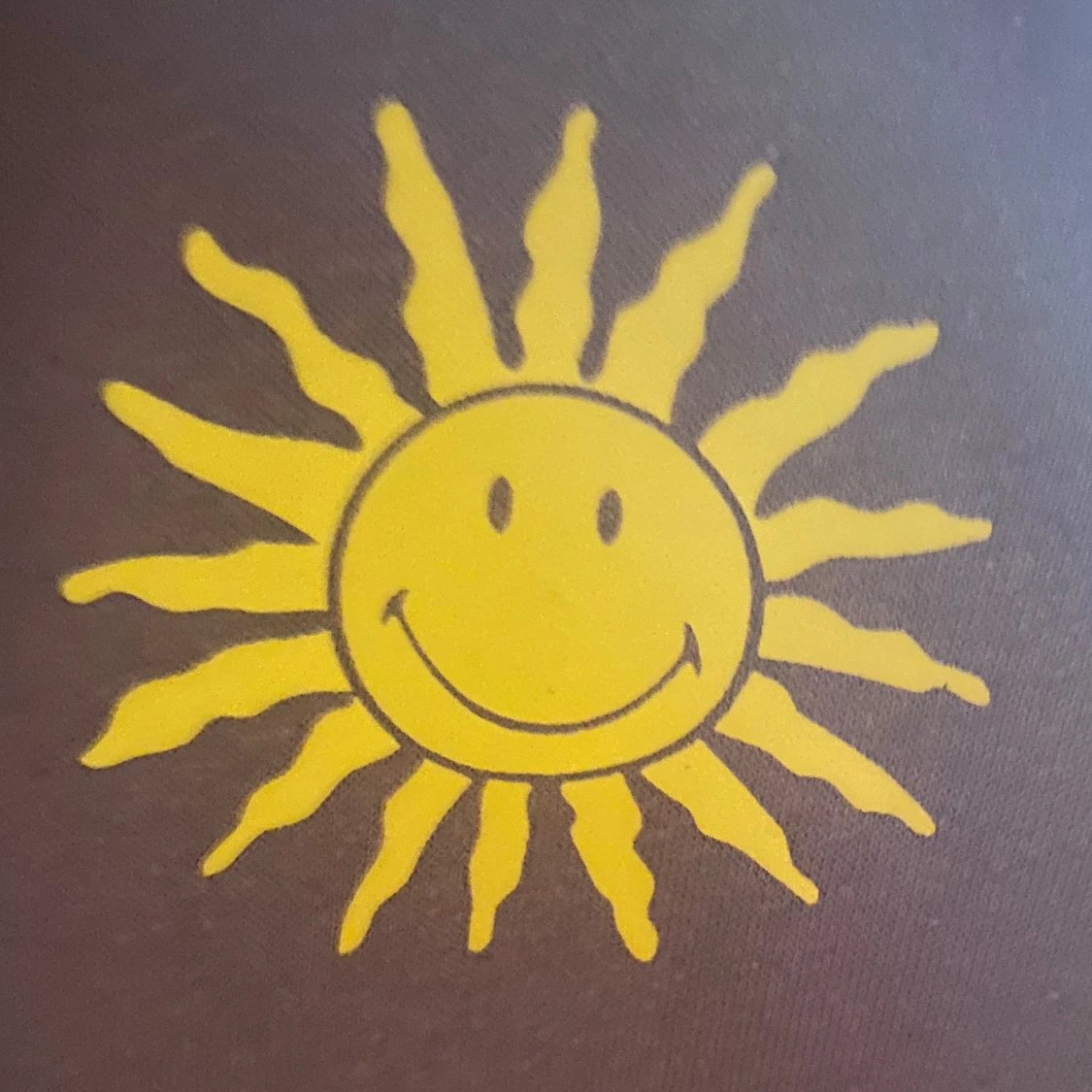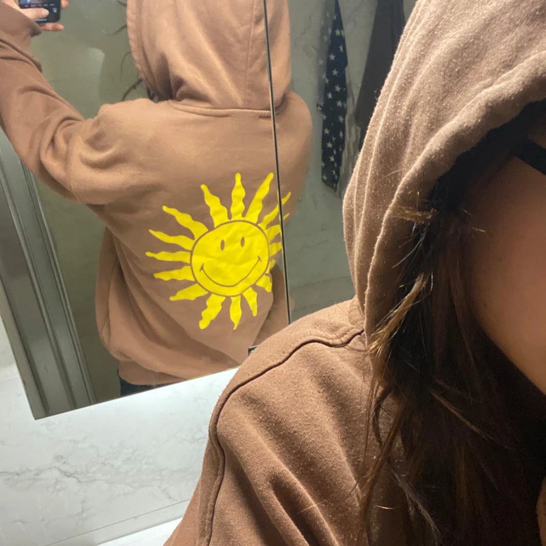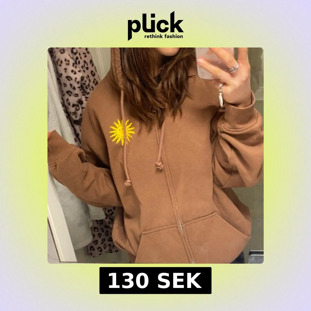 Säljer en jätte mysig brun hoodie med dragkedja och ett gult soltryck på bröstet och ryggen. Tröjan har en luva med snören och långa ärmar.