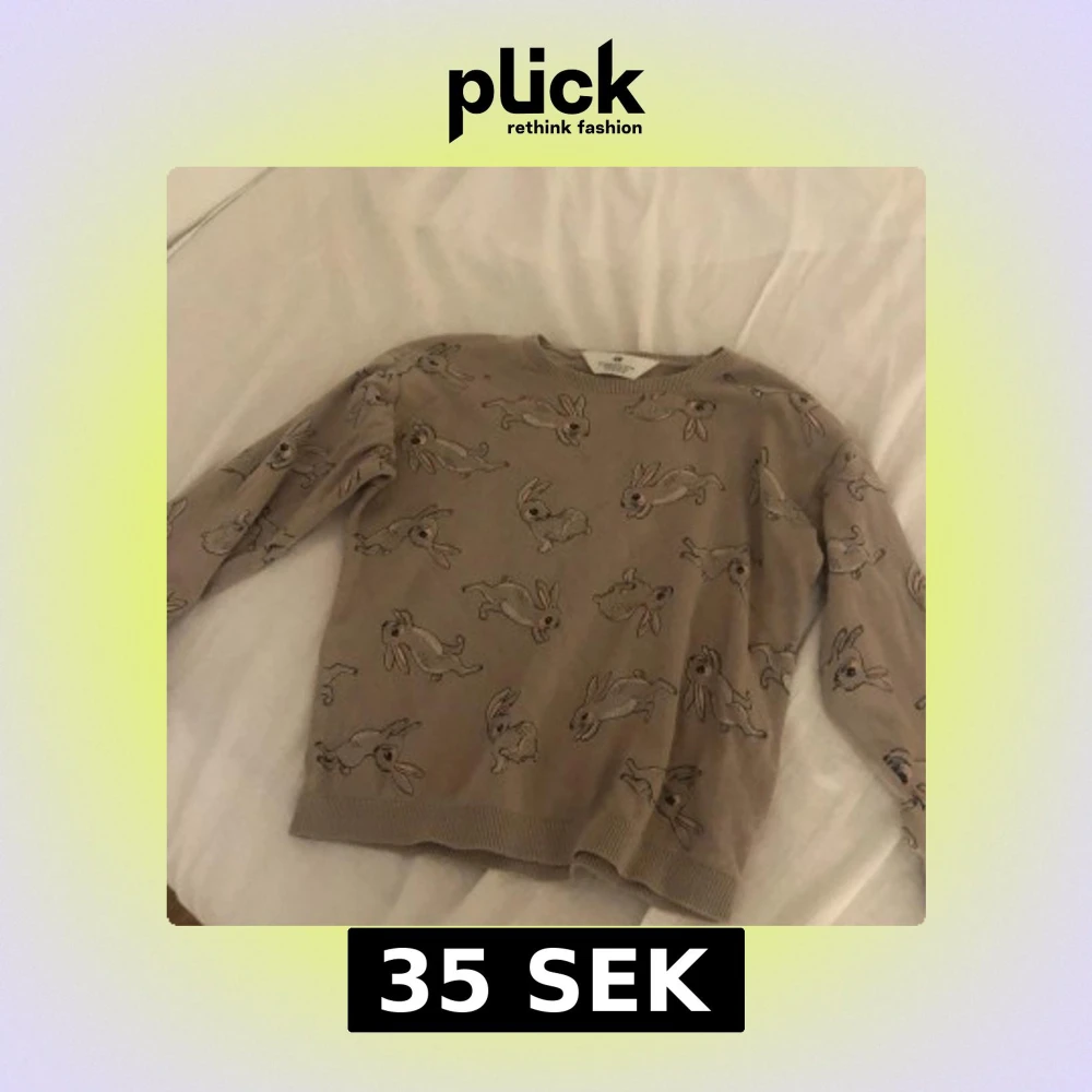 Supersöt beige tröja från H&M med gulligt kaninmönster över hela plagget. Tröjan har rund halsringning, långa ärmar och ribbade muddar vid ärmslut och nederkant. Perfekt för dig som gillar djur och vill ha en mysig och lekfull stil.