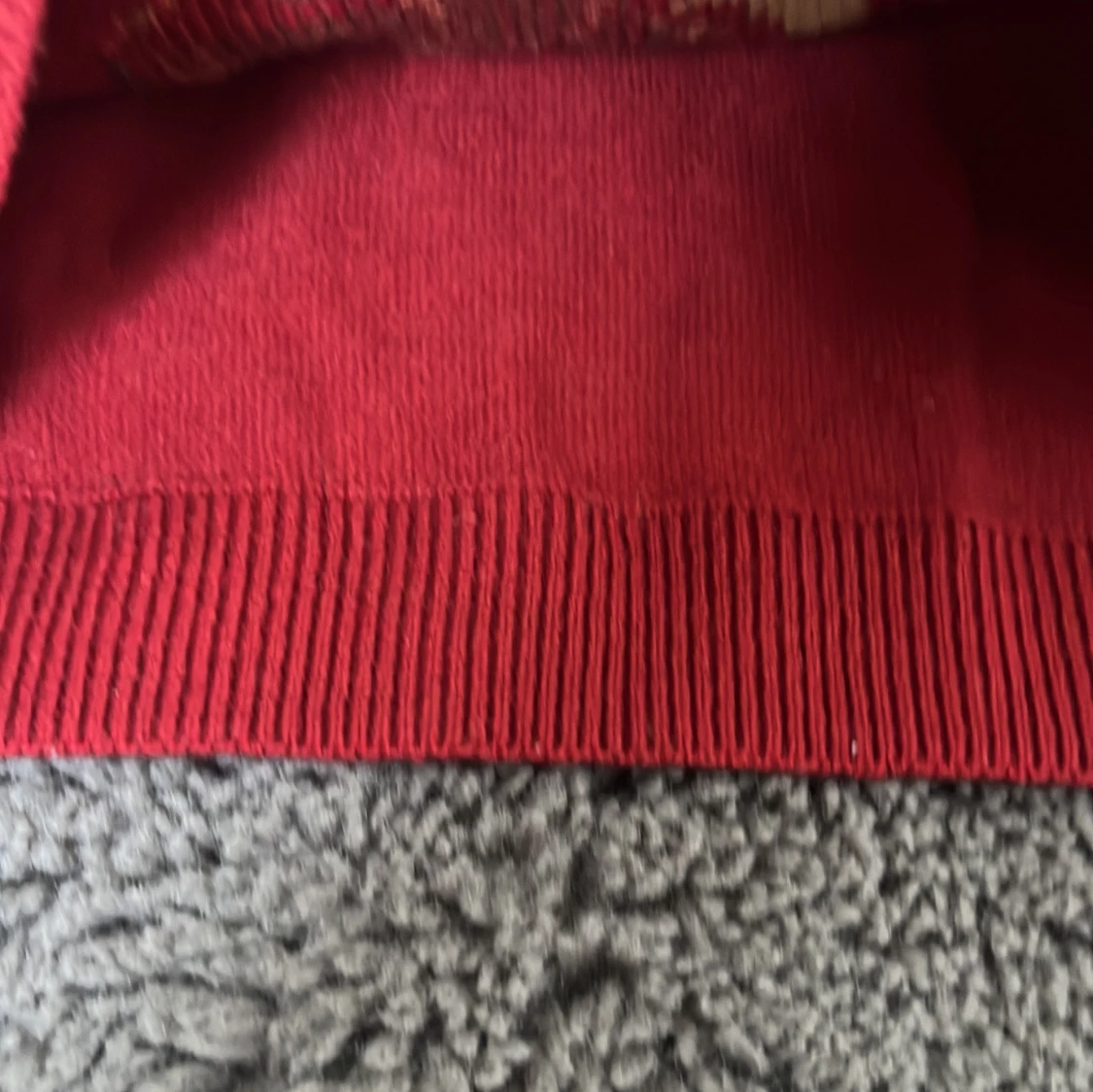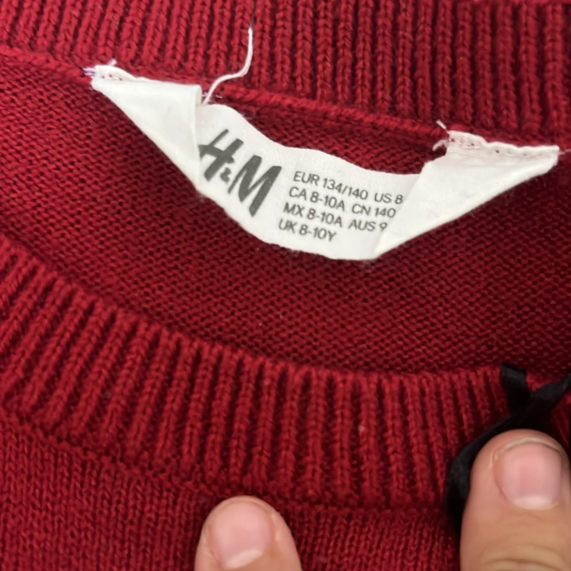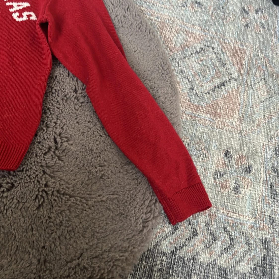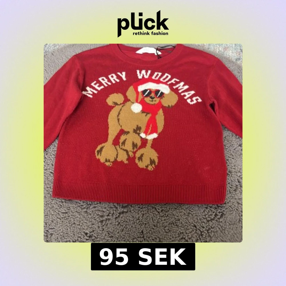Rolig röd stickad jultröja från H&M med texten 'Merry Woofmas' och en cool hund med tomteluva och solglasögon på framsidan. Tröjan har långa ärmar och ribbade muddar vid ärmslut och nederkant. Perfekt för julens alla tillfällen! Har bara använt en jul alltså en dag💕