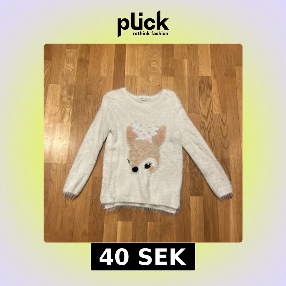 Mysig vit tröja från H&M med ett gulligt renmotiv på framsidan. Renens horn är dekorerade med paljetter och pärlor, vilket ger en festlig touch. Tröjan är långärmad och har en fluffig textur som gör den perfekt för kyligare dagar. Också perfekt jul tröja ❤️