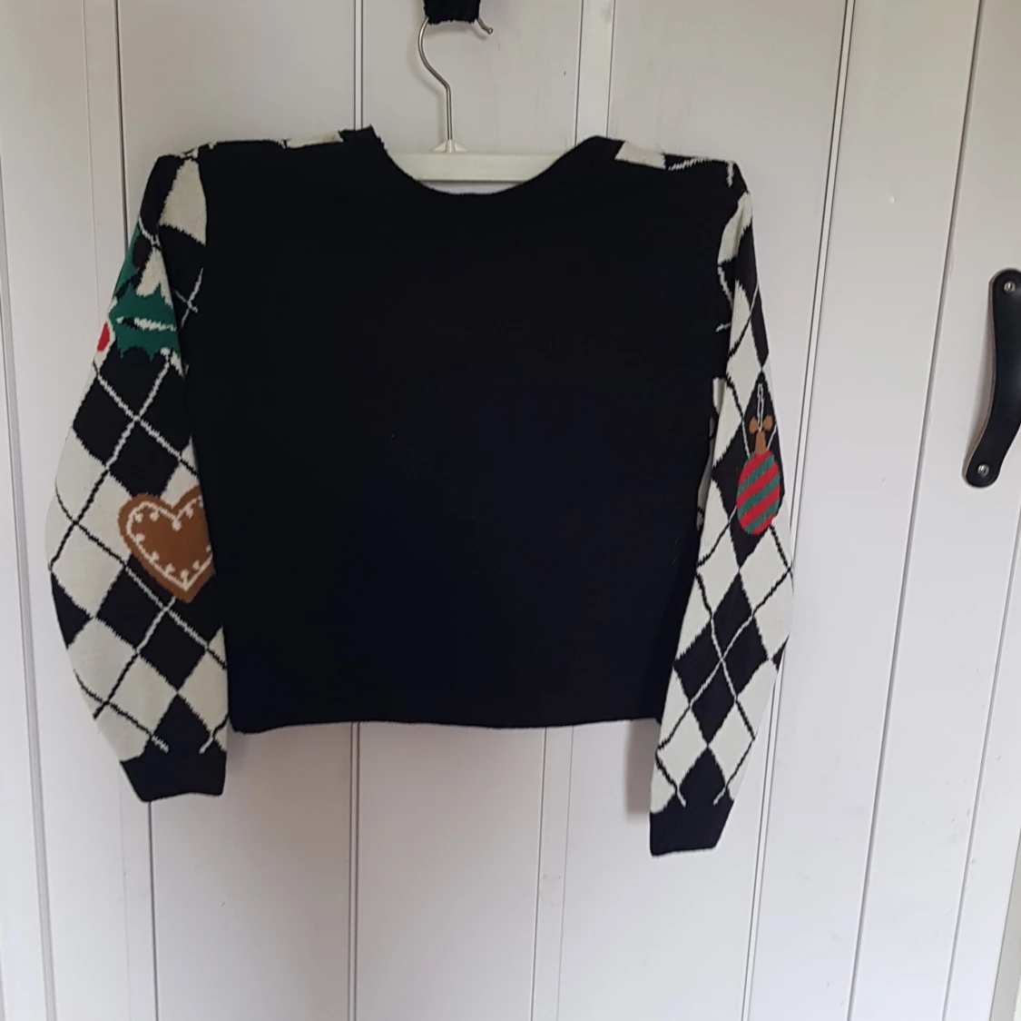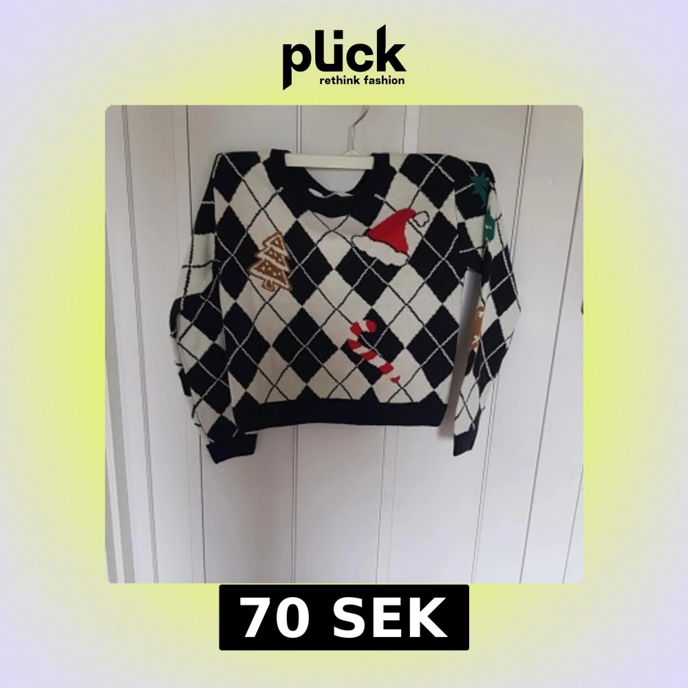 Snygg svartvit stickad tröja från H&M med rutigt mönster och juliga detaljer som tomteluva, pepparkaka, polkagris och julgranskulor. Långärmad och perfekt för vinterns mysiga dagar. Tröjan har en klassisk passform och är riktigt skön att ha på sig.
