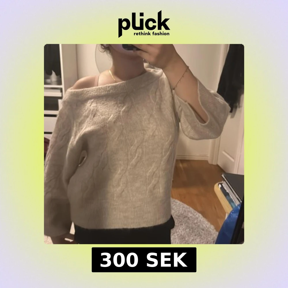 Supermysig beige kabelstickad tröja från H&M med bred ribbad kant och offshoulder-look. Tröjan har lång ärm och en loose passform som ger en chill vibe. Perfekt för lager på lager under höst och vinter.