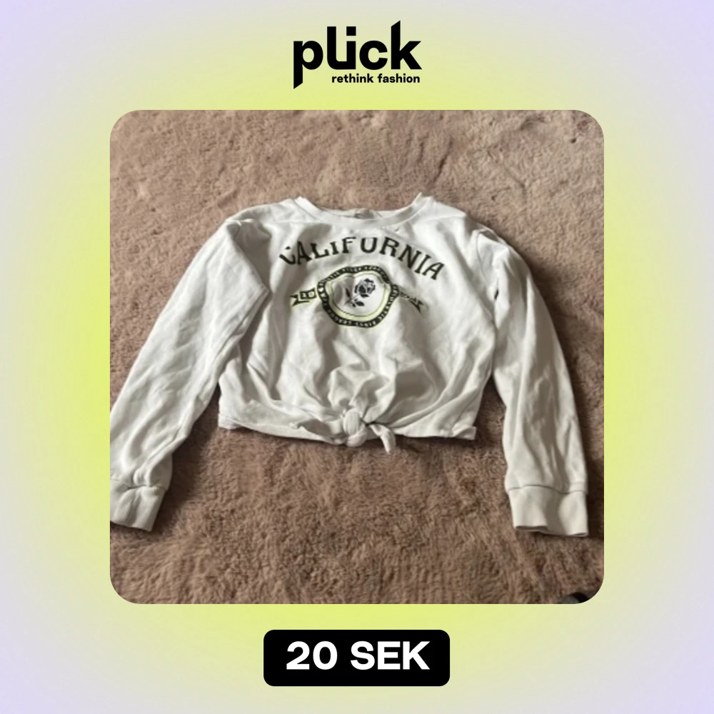 Säljer en superfin vit långärmad tröja från H&M. Den har ett coolt 'California' tryck med en ros och texten 'Athletic First League' i svart och grönt. Tröjan är croppad och har en knytning framtill, vilket ger den en avslappnad och trendig look. Perfekt för vår och sommar!