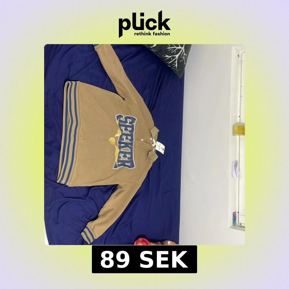 Cool beige pikétröja från H&M med stor blå och gul SEEKER-tryck på bröstet. Tröjan har krage, knappar och blå ränder vid ärmslut och nederkant. Perfekt för dig som gillar sportig och avslappnad stil.