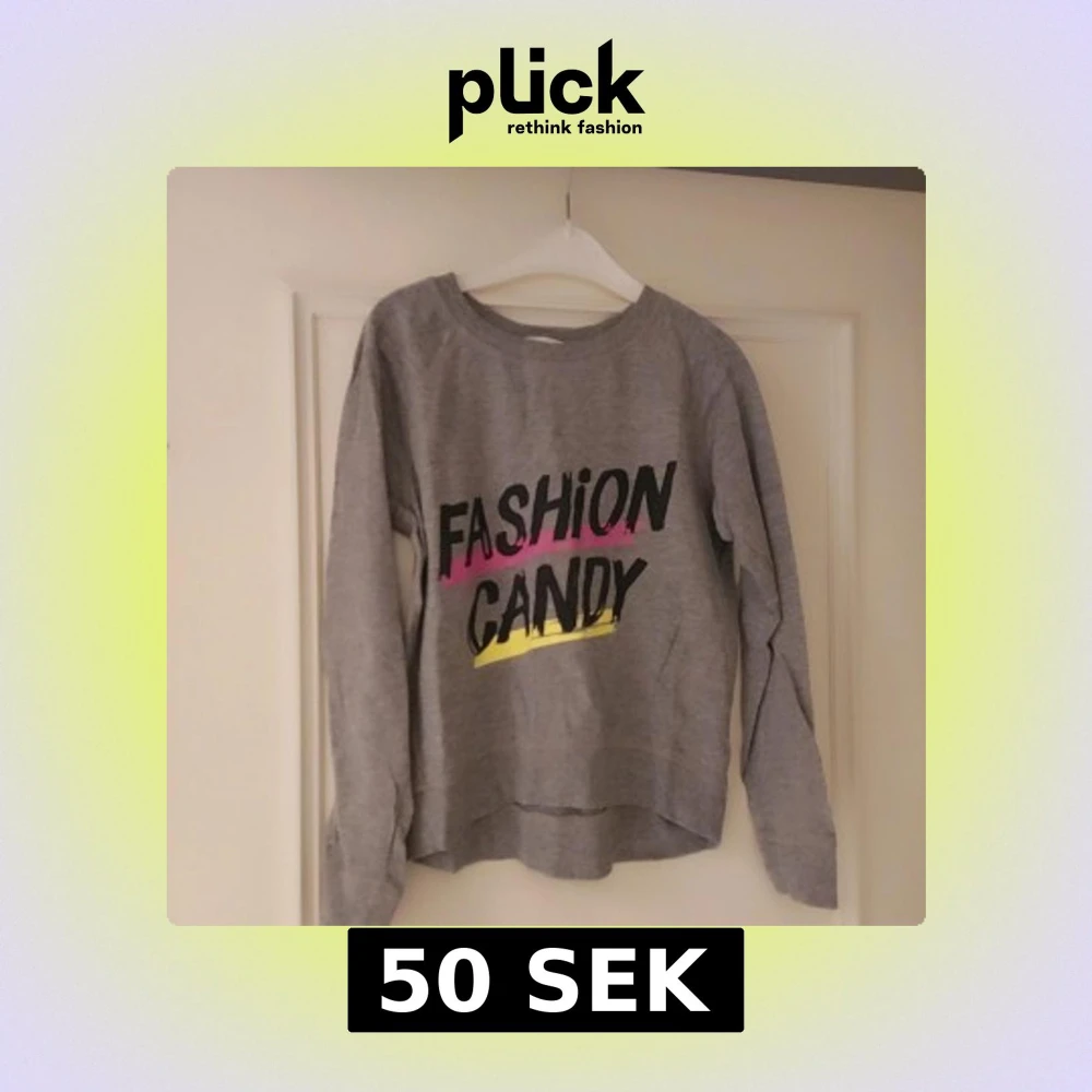 Säljer en grå tröja från H&M med texten 'Fashion Candy' i svart, rosa och gul. Tröjan har långa ärmar och en rund halsringning. Perfekt för en avslappnad stil.Storlek är 140,10 år