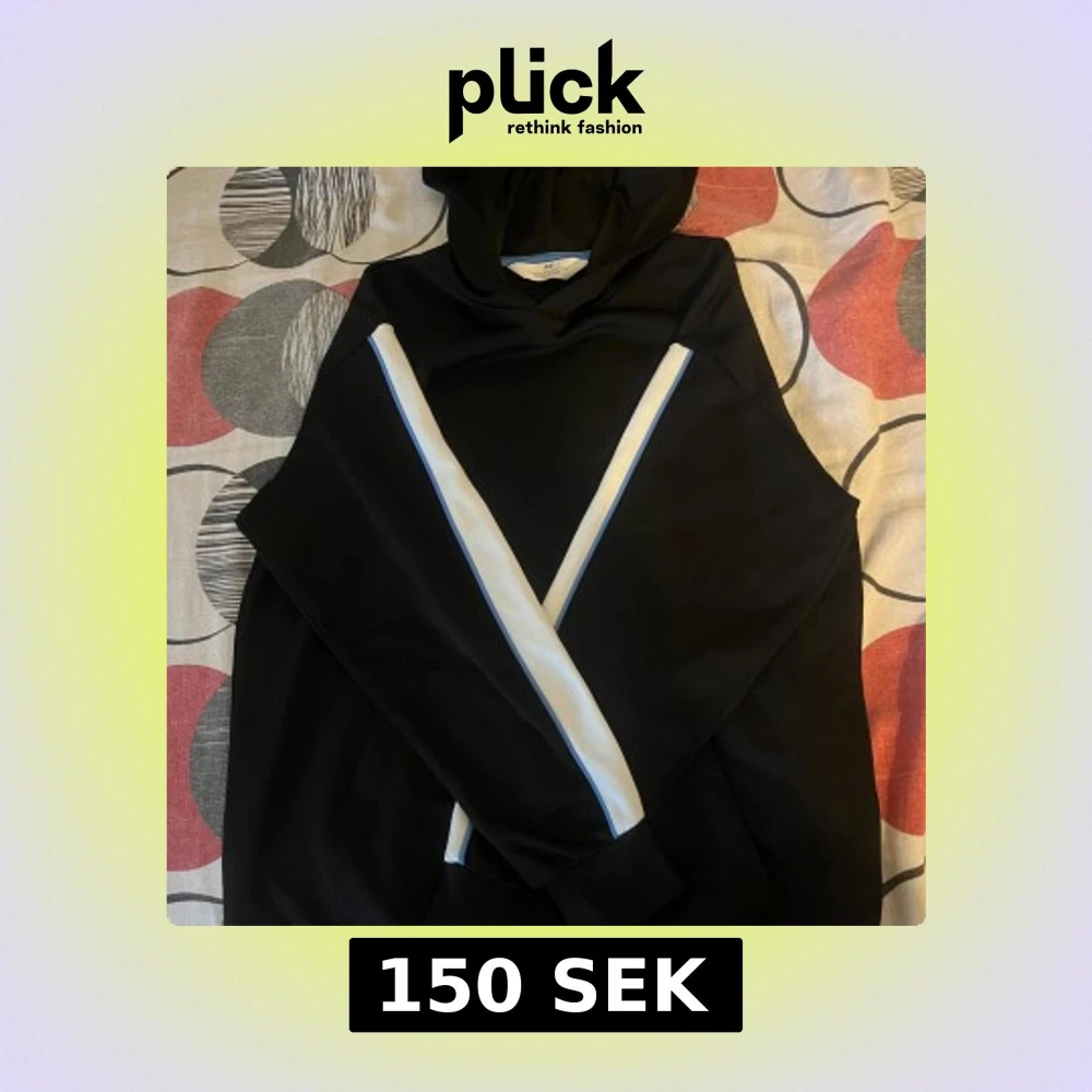 Säljer en svart hoodie från H&M med vita och blå ränder i ett V-mönster framtill. Tröjan har huva och en stor magficka. Perfekt för dig som gillar sportig stil.