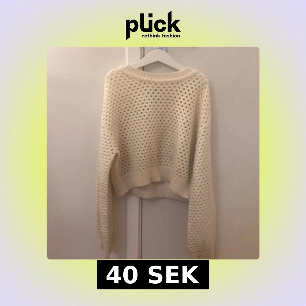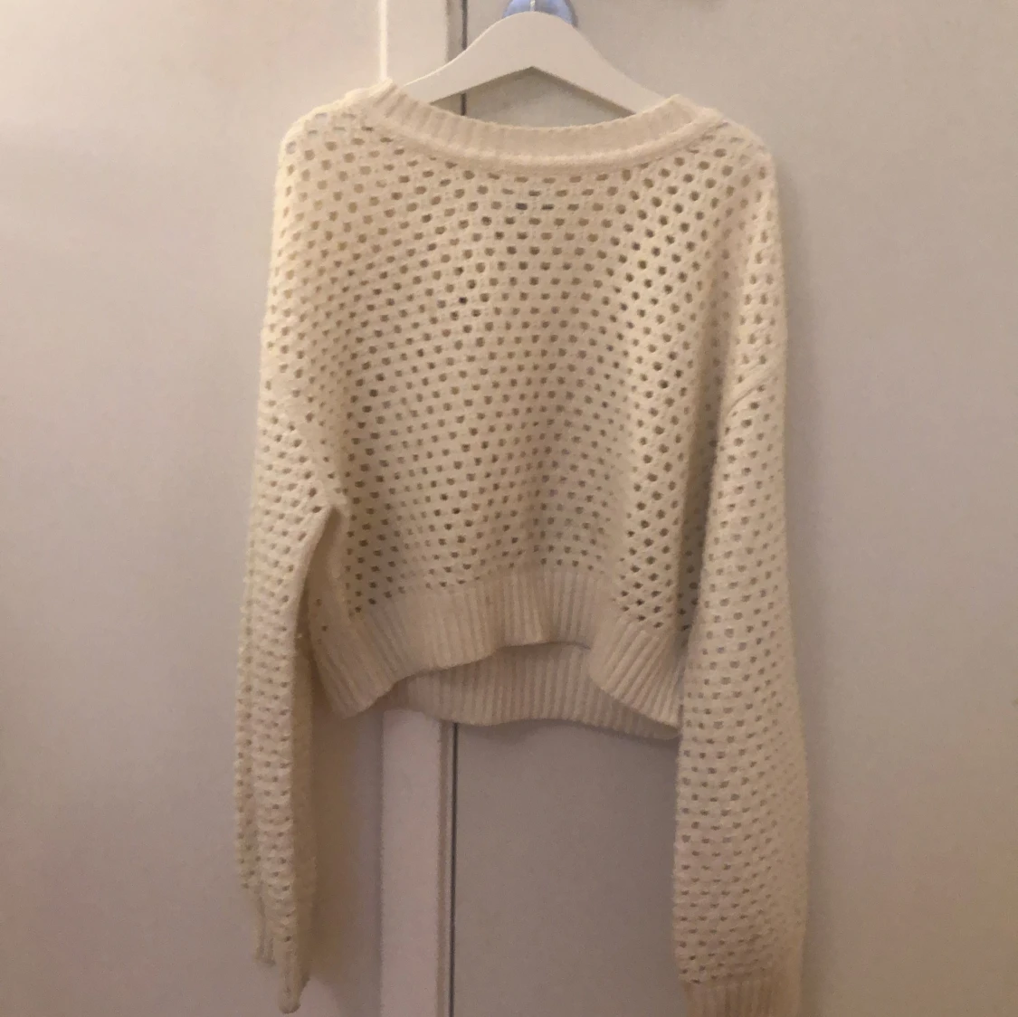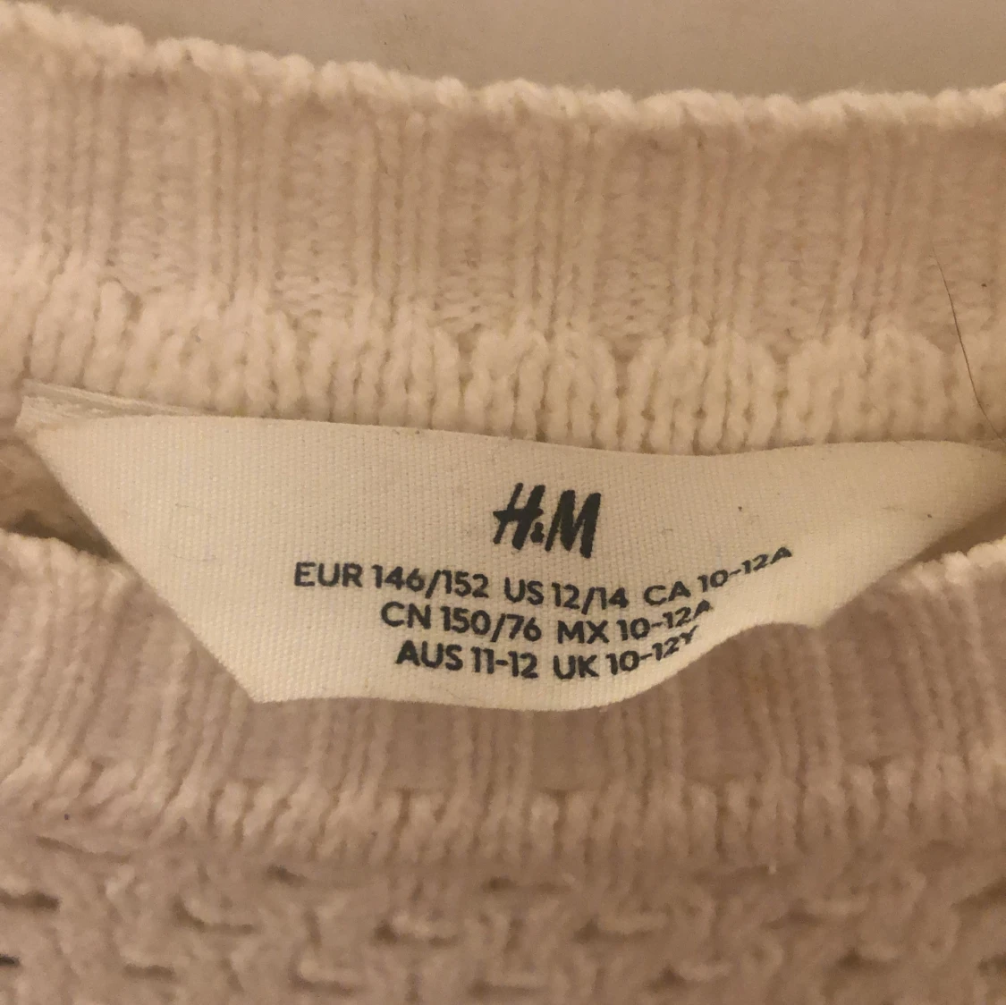 Säljer en vit stickad tröja från H&M med hålmönster och ribbade muddar. Tröjan har en avslappnad passform och långa ärmar, perfekt för lager-på-lager. Enkel att styla med både jeans och kjol.