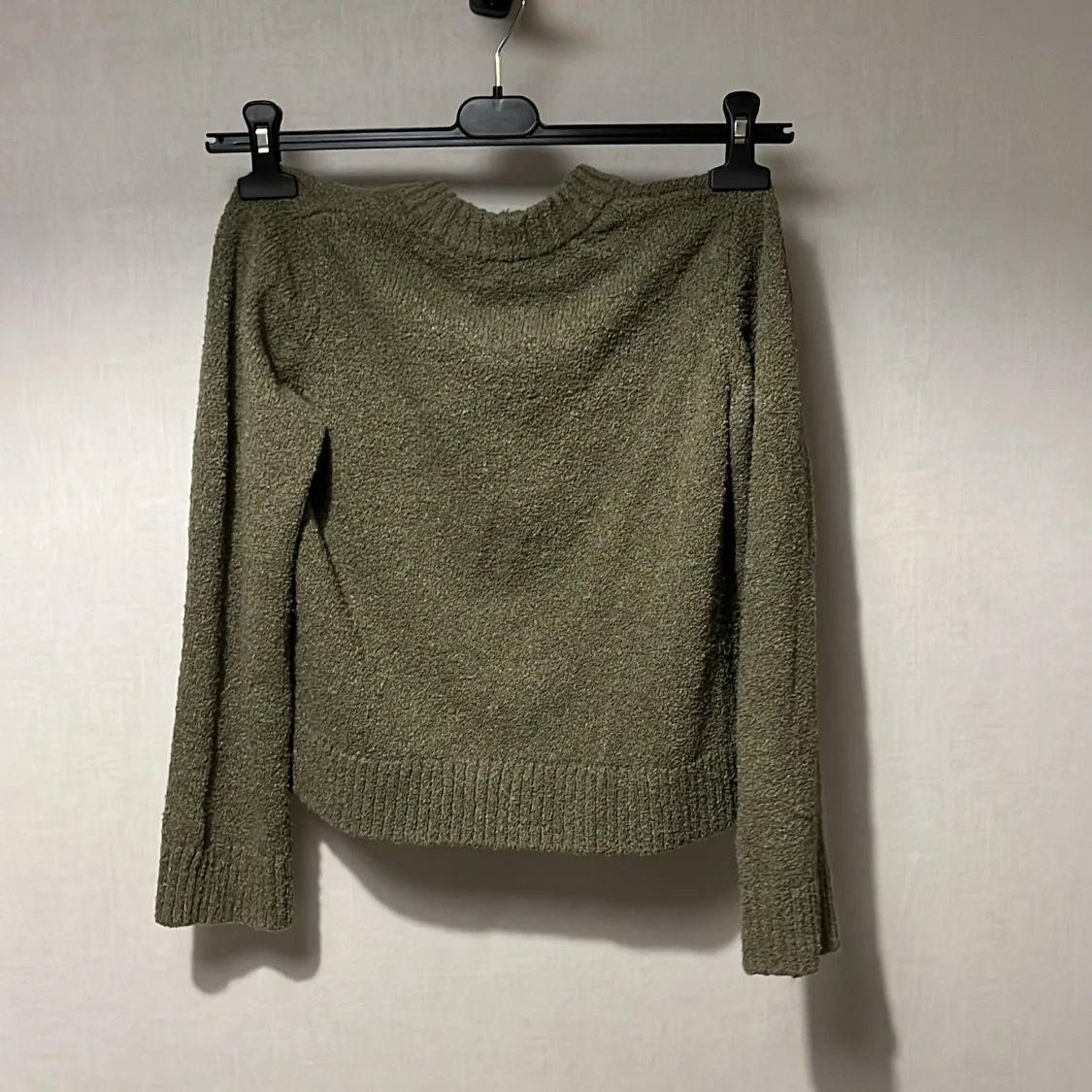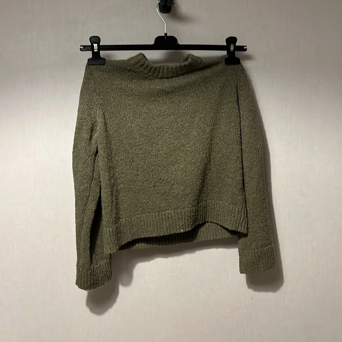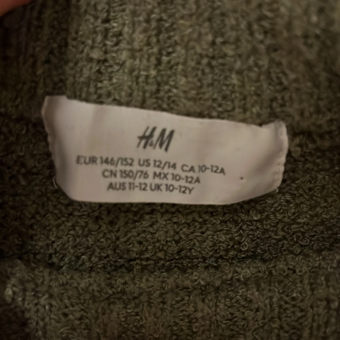 Säljer en olivgrön stickad tröja från H&M i storlek 146/152. Tröjan har en enkel design med ribbad kant vid hals, ärmslut och nederkant. Den är långärmad och har en loose passform som gör den skön att bära under kyliga dagar.
