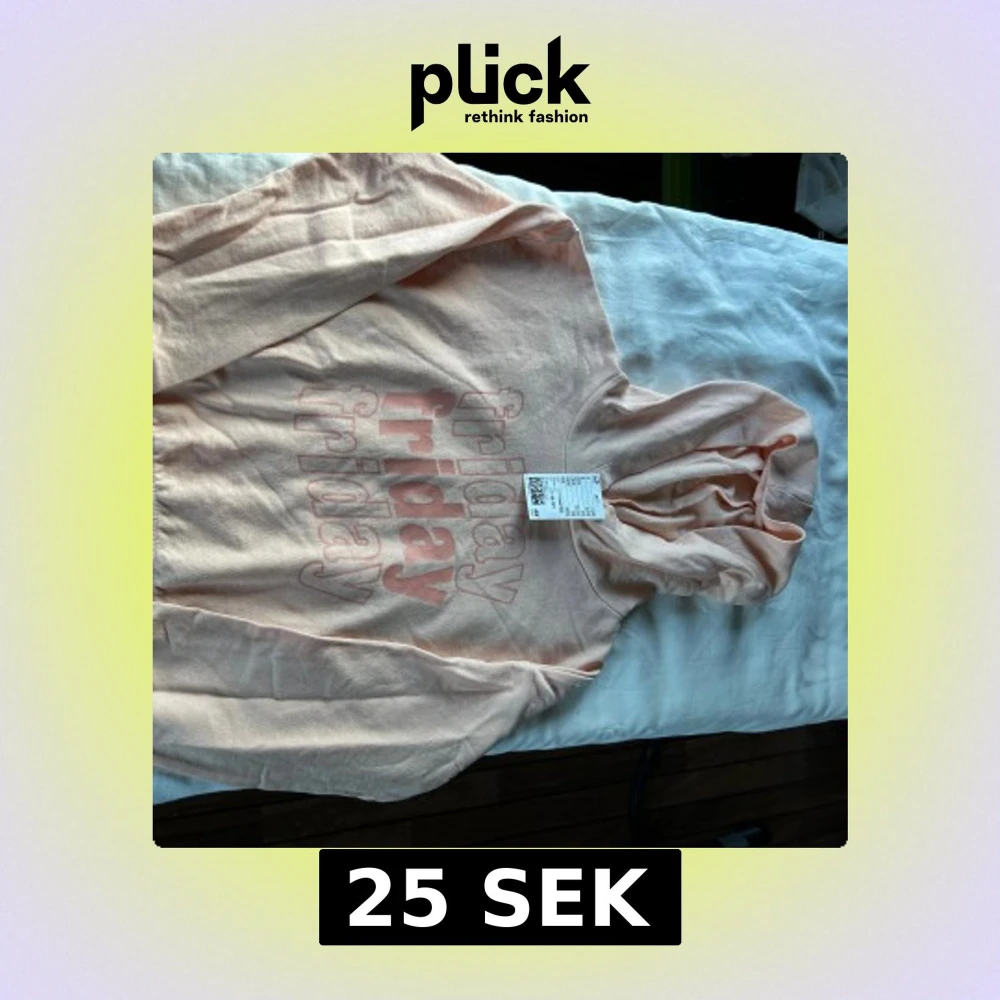 Säljer en ljust aprikos hoodie från H&M med coolt 'friday' tryck på framsidan. Tröjan är kort, har huva, långa ärmar och är gjord i mjuk bomull och polyesterblandning.