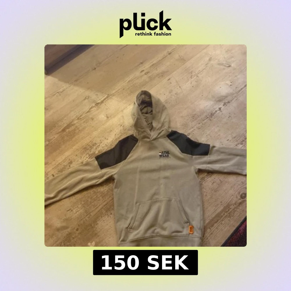 Snygg beige hoodie från H&M med svart detalj på axlarna och trycket ATHL WEAR framtill. Tröjan har huva, magficka och långa ärmar. Perfekt för chill eller sportig stil. Mjuk bomullskänsla och cool kontrast mellan färgerna.