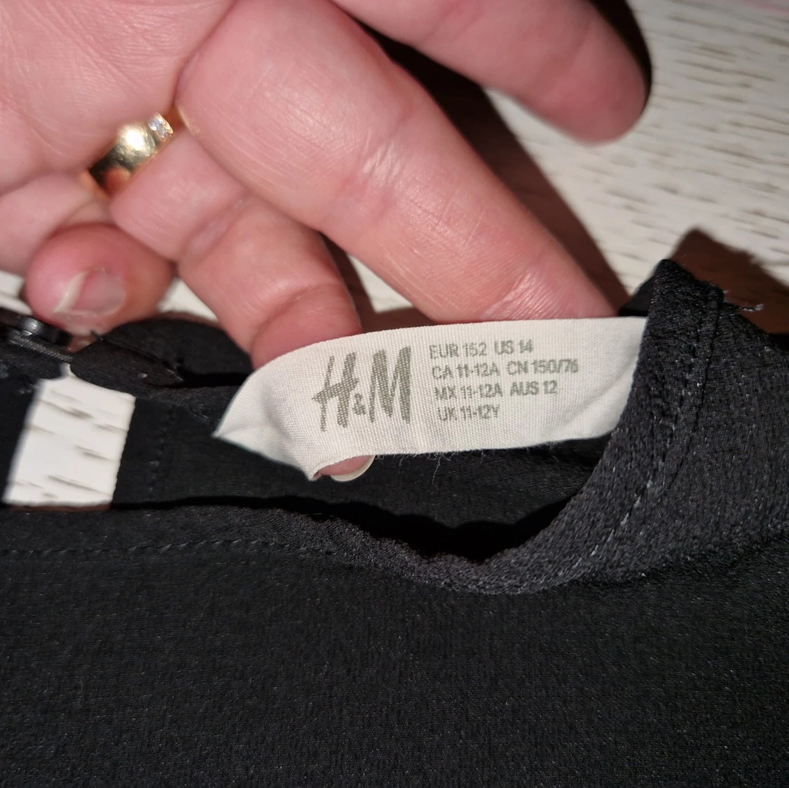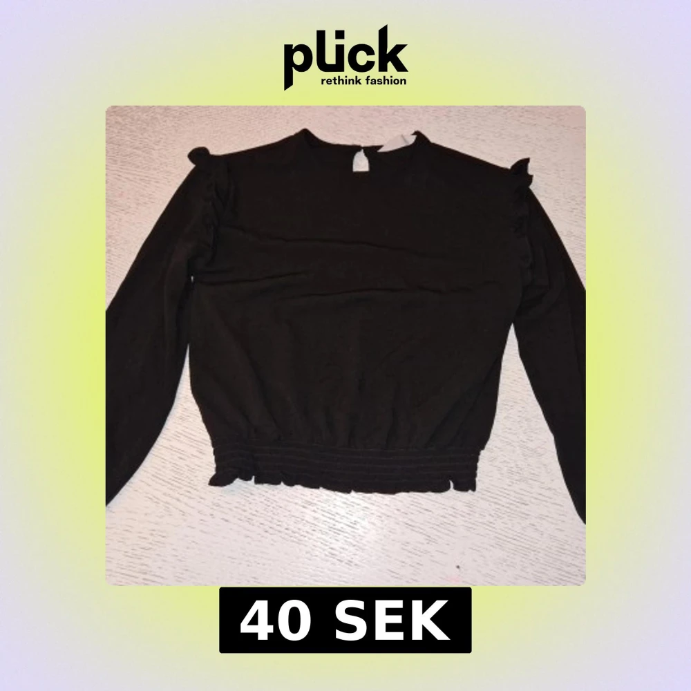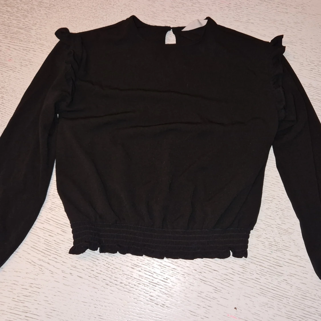 Svart långärmad blus från H&M med volangdetaljer på axlarna och smockad resår i midjan. Enkel och stilren modell som passar perfekt till jeans eller kjol. Rund halsringning och knapp i nacken för enkel påklädning.