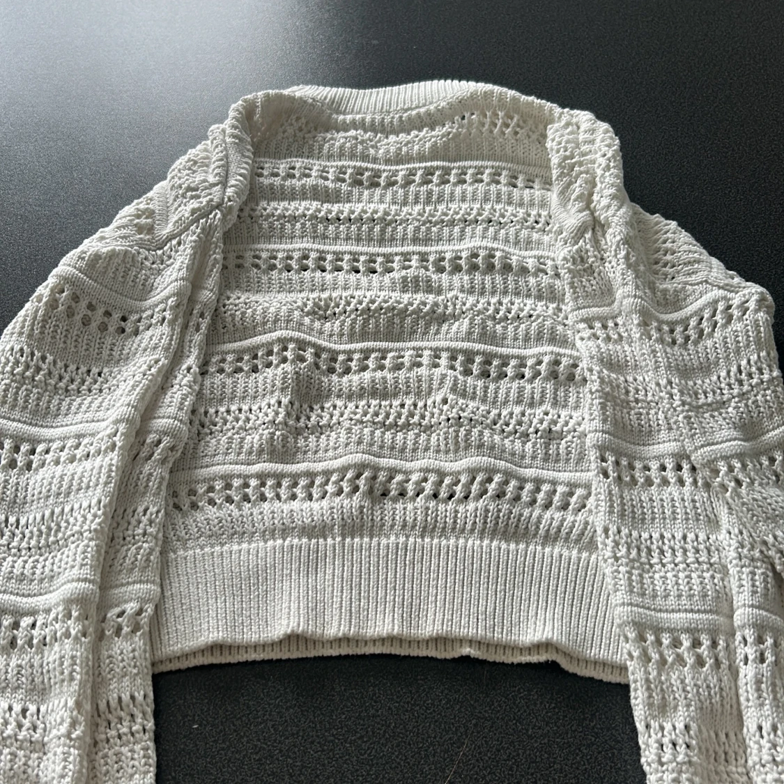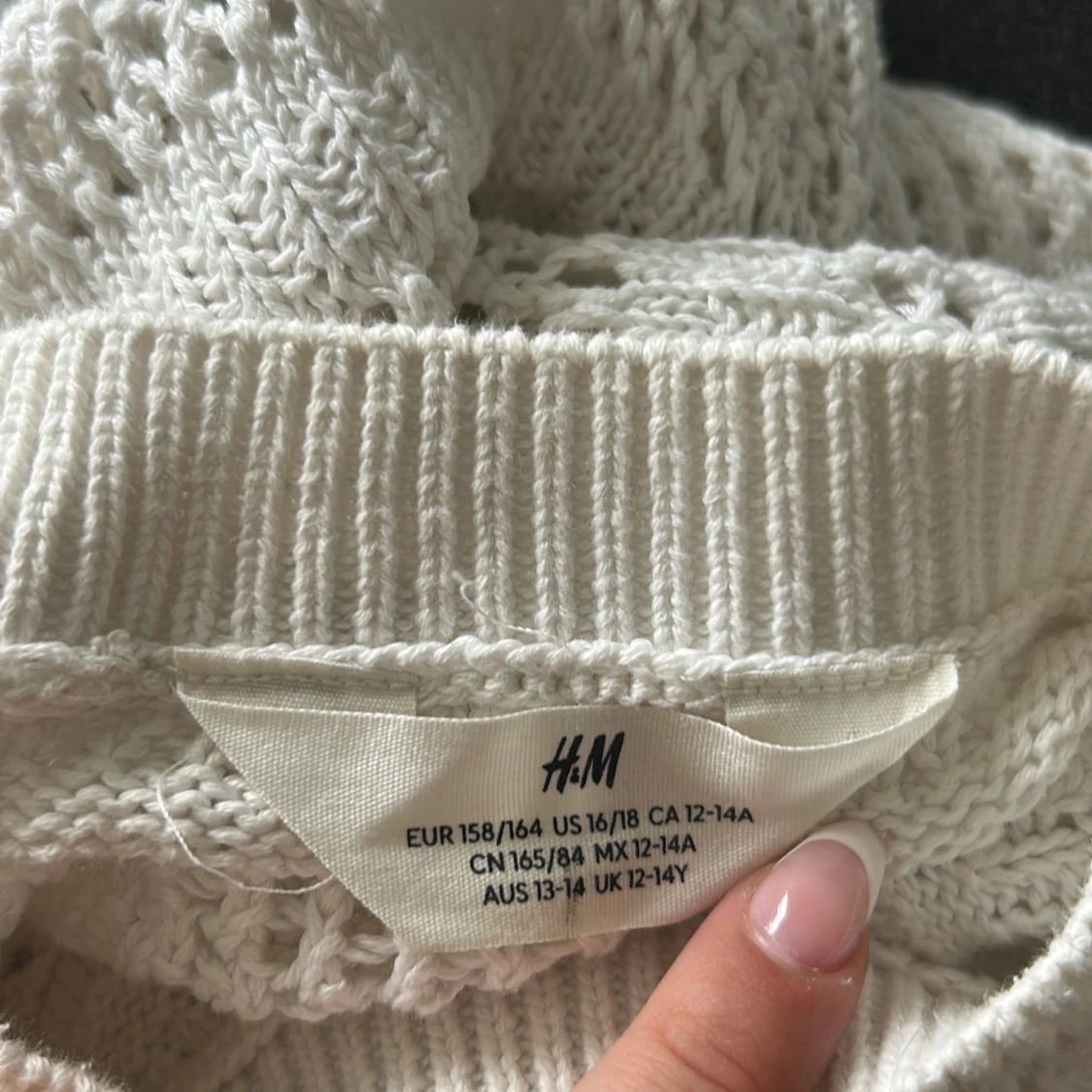 Superfin vit stickad tröja från H&M med snyggt hålmönster och ribbade muddar. Tröjan har lång ärm och är lite croppad i modellen, perfekt till jeans eller kjol. Mjuk och skön, passar både till skolan och häng med kompisar.