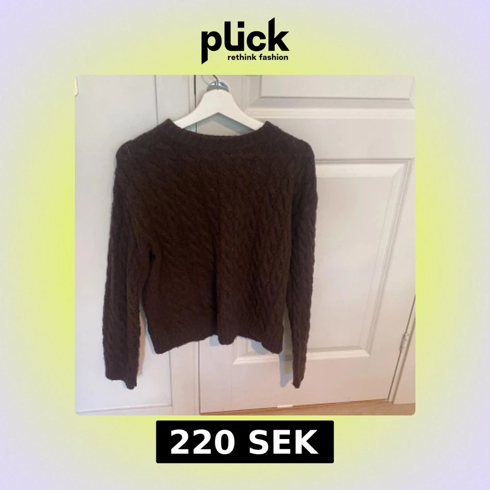 Mysig brun stickad tröja från H&M med kabelstickat mönster. Tröjan har rund hals och långa ärmar, perfekt för kyliga dagar. Passar dig som gillar klassisk stil med en twist. Snygg att matcha med jeans eller kjol.