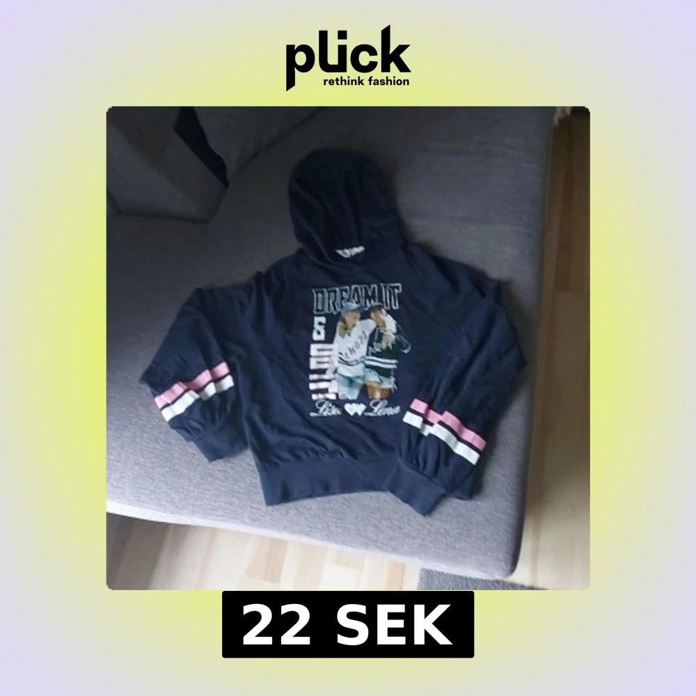 Snygg mörkblå hoodie med huva och tryck framtill med texten 'Dream it' och bild på två tjejer. Ärmarna har coola rosa, vita och svarta ränder som ger en sportig vibe. Perfekt för dig som gillar streetstyle och bekväma plagg.