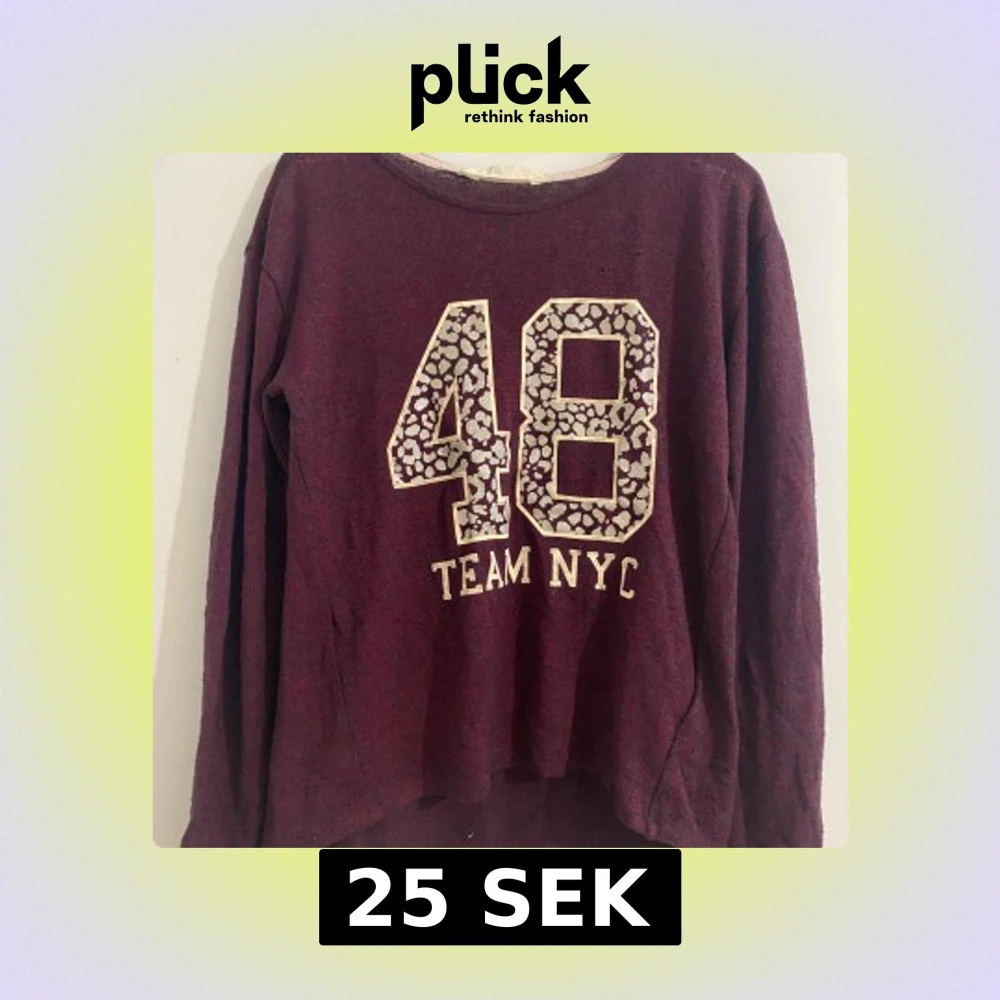 Vinröd långärmad tröja från H&M med stort tryck '48 TEAM NYC' framtill. Siffrorna har ett coolt leopardmönster i silver. Tröjan är i mjukt stickat material och har en avslappnad passform. Perfekt för dig som gillar sportig och trendig stil.