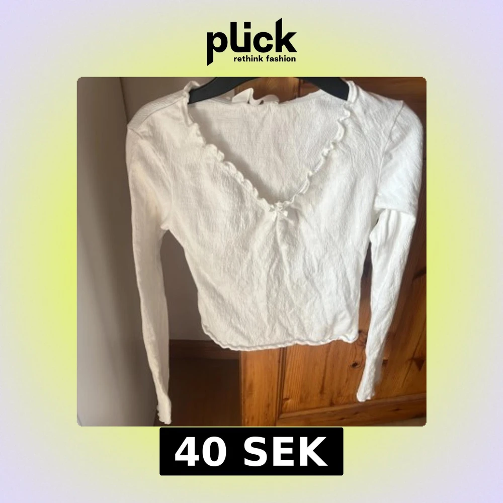 Supersöt vit långärmad blus från H&M med v-ringning och liten rosett framtill. Blusen har vågig kant vid halsen och är gjord i ett lätt, strukturerat bomullstyg. Perfekt för dig som gillar en feminin och enkel stil.