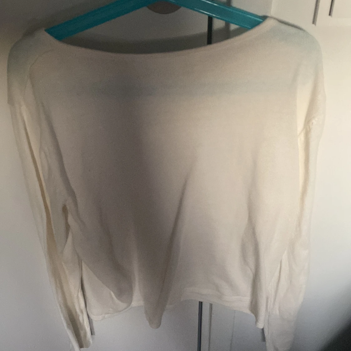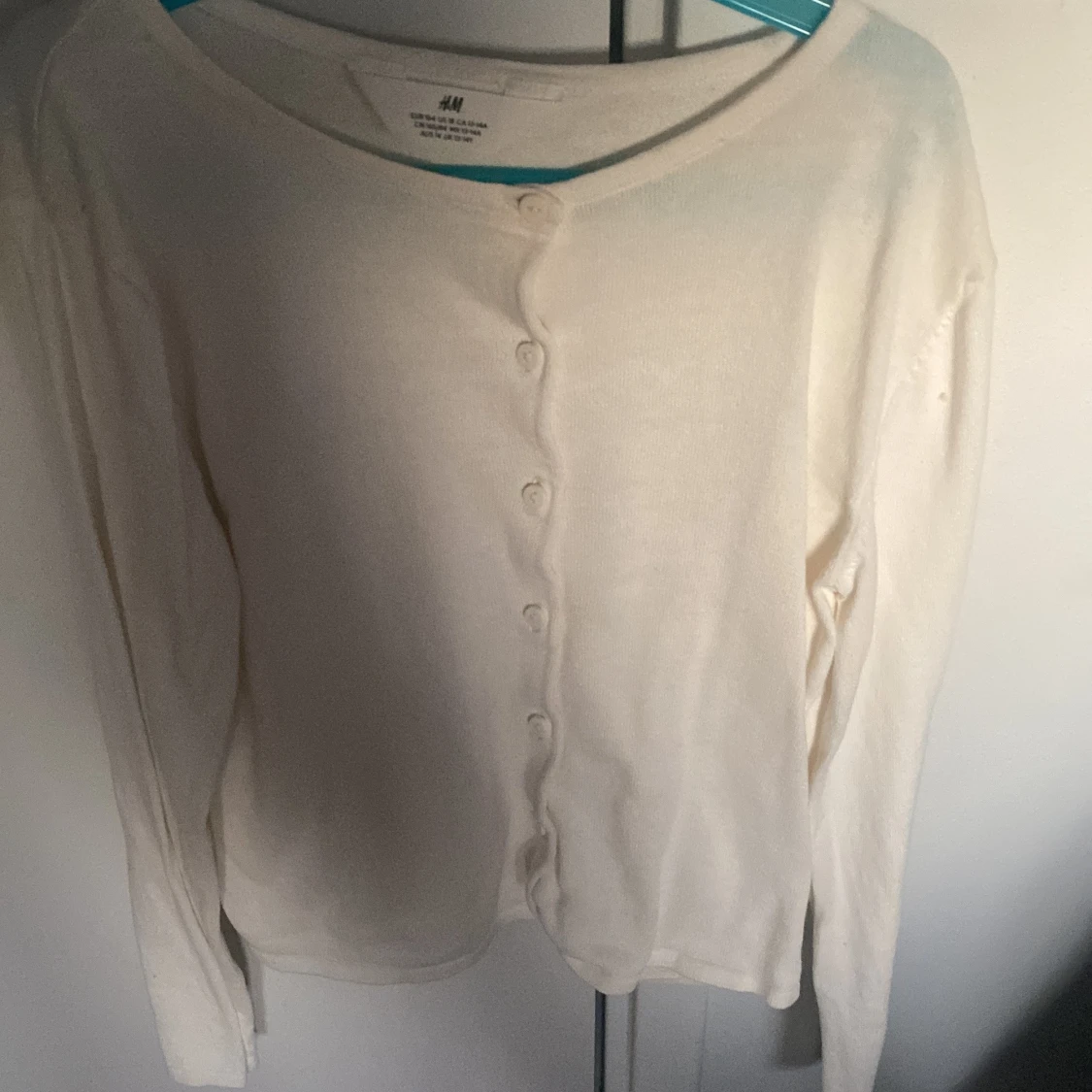 Säljer en stilren vit kofta från H&M med knappar framtill. Perfekt för lager-på-lager och passar till många olika outfits. Koftan har långa ärmar och en rund halsringning.