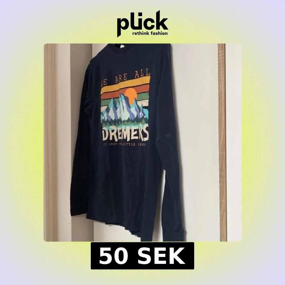 Tja folket! Säljer en schysst mörkblå långärmad tröja från H&M med färgglatt tryck framtill som föreställer berg, solnedgång och texten 'We are all dreamers'. Tröjan är i mjuk bomull och har en klassisk passform med rund hals. Perfekt för dig som gillar coola prints och bekväma plagg. Pris kan diskuteras samt hojta till vid övriga frågor 👍.