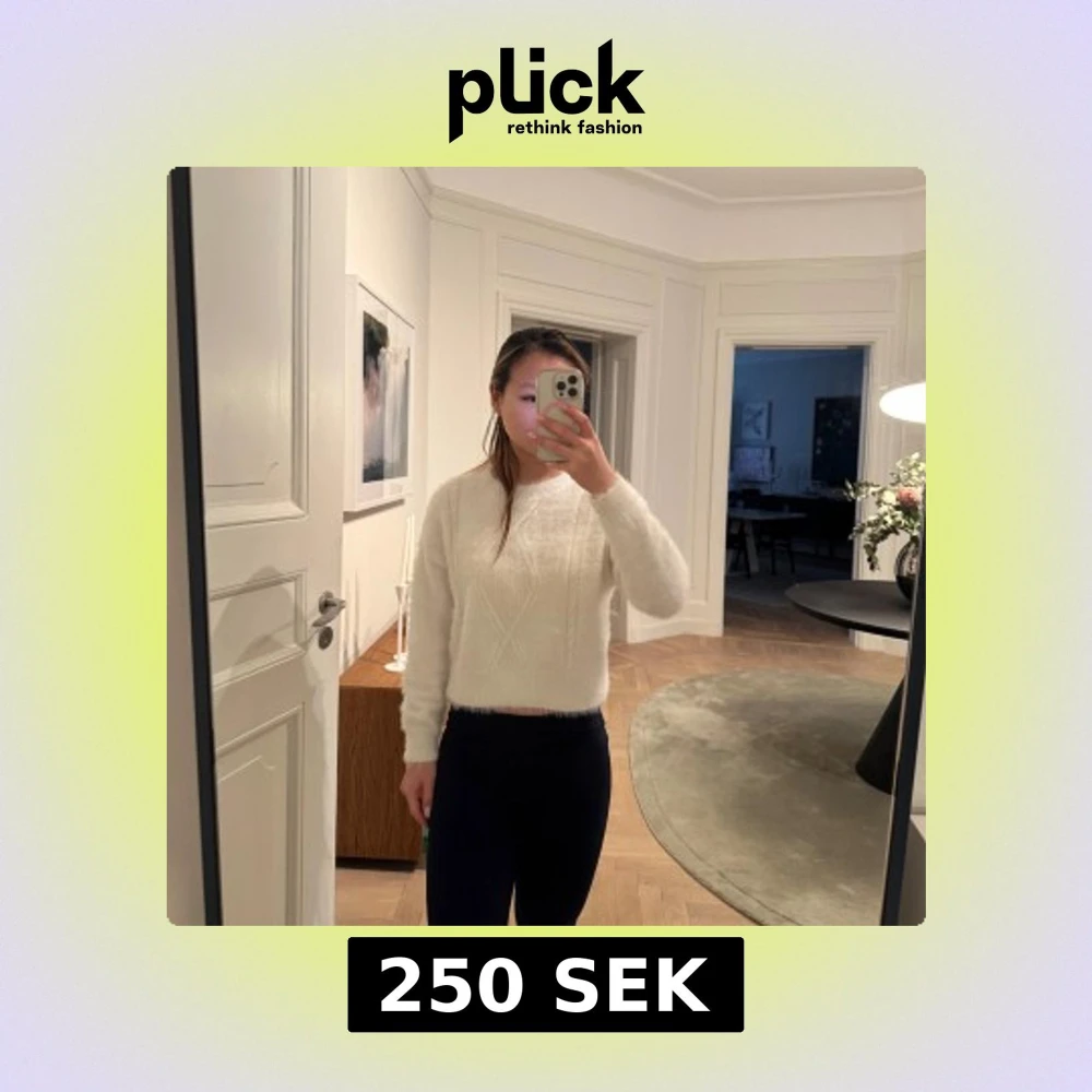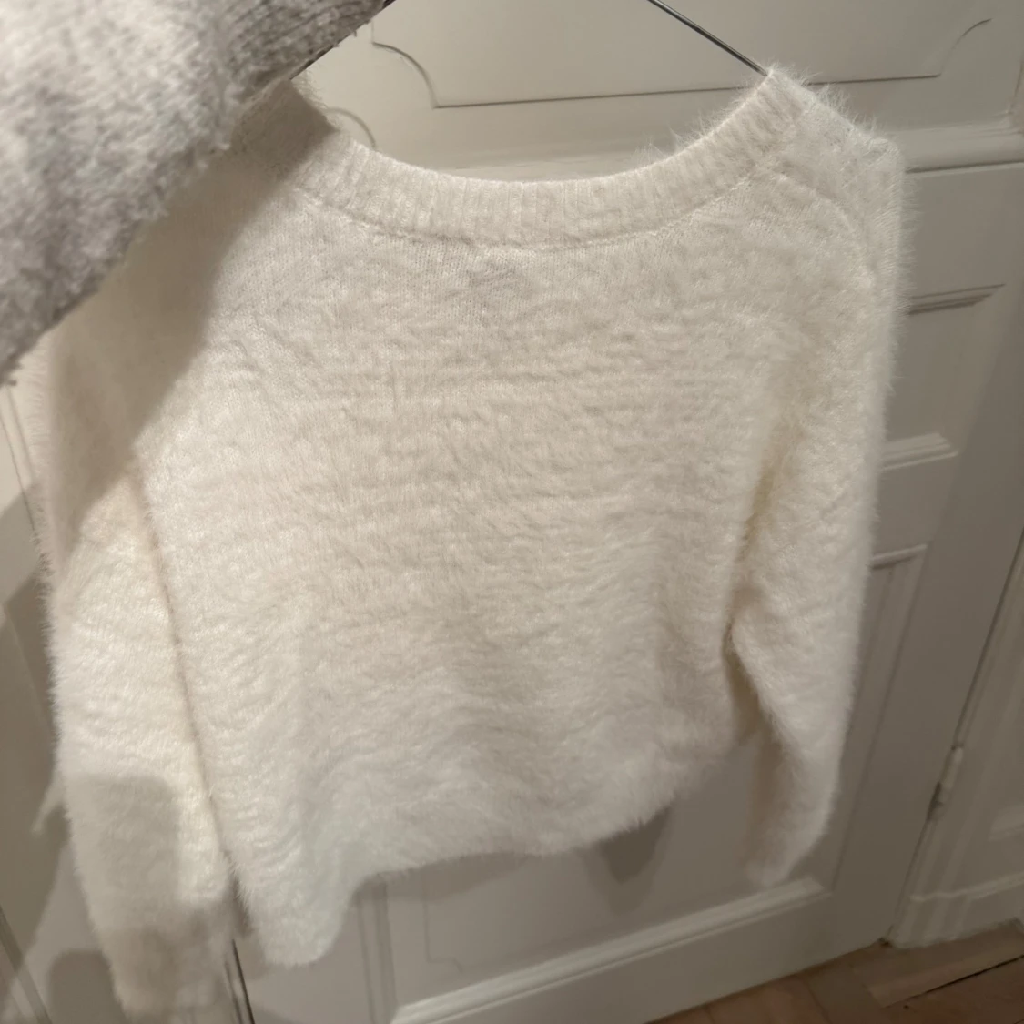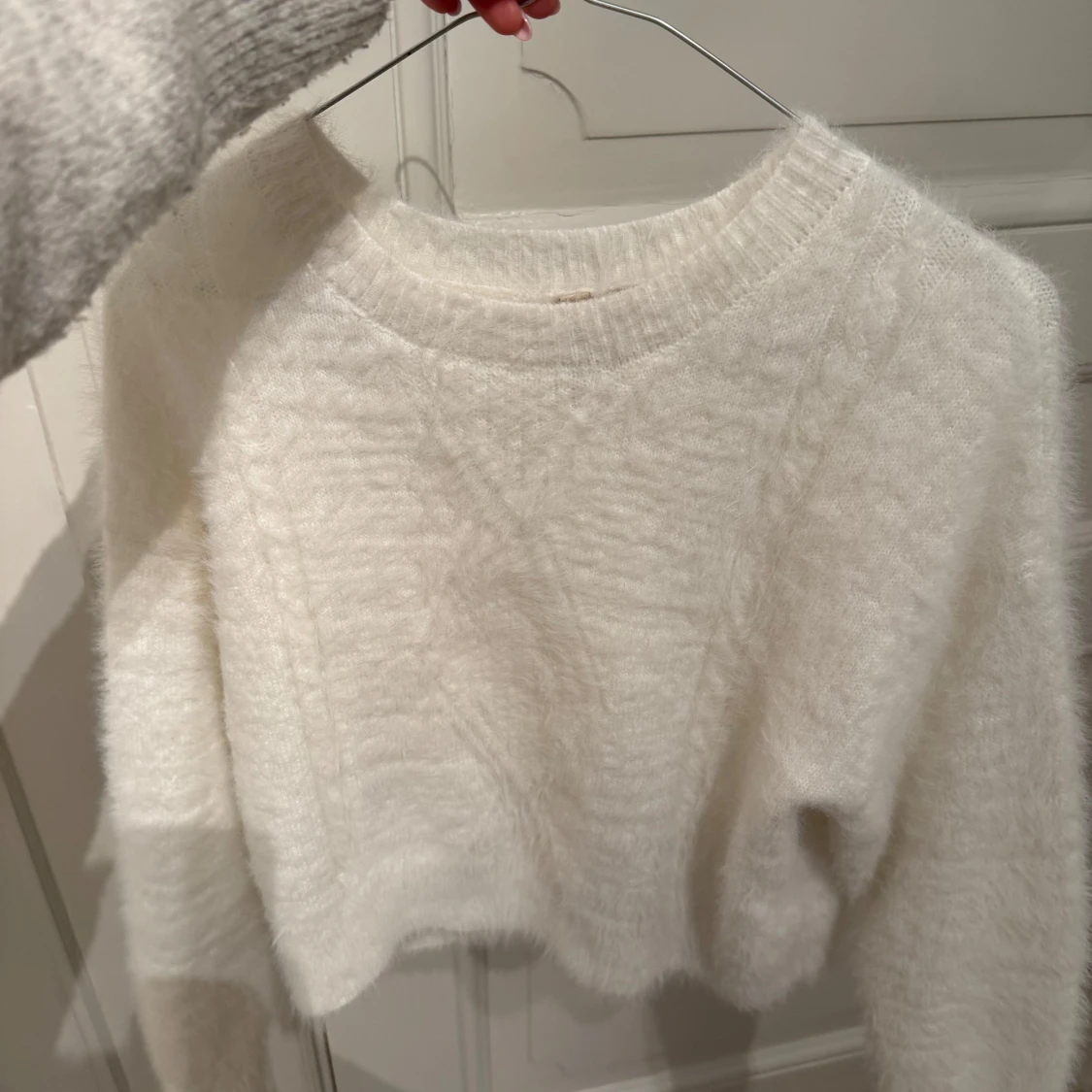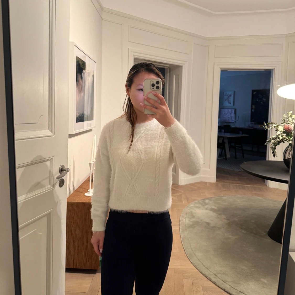 Mysig vit tröja med fluffig textur. Den har en croppad design och långa ärmar, perfekt för kyligare dagar. Enkel och stilren, passar till många olika outfits.