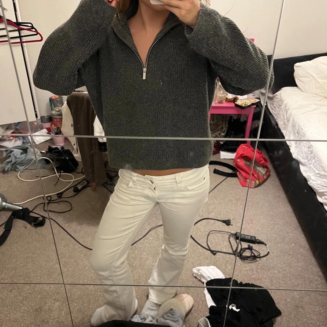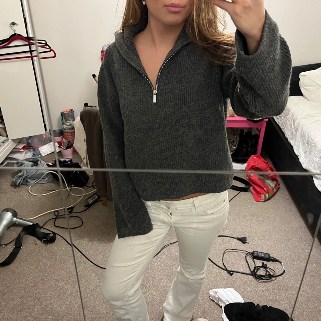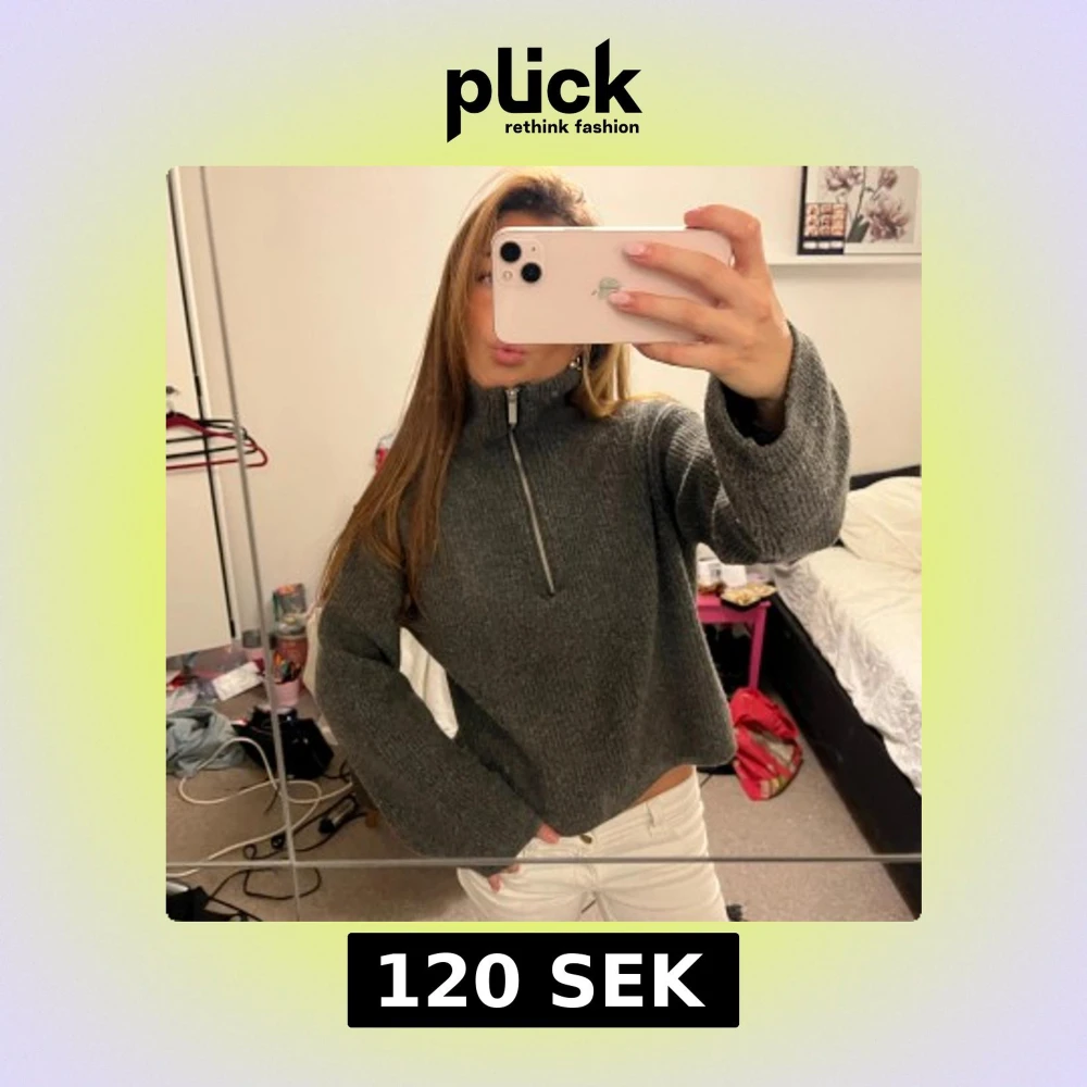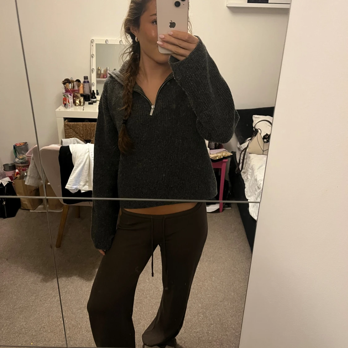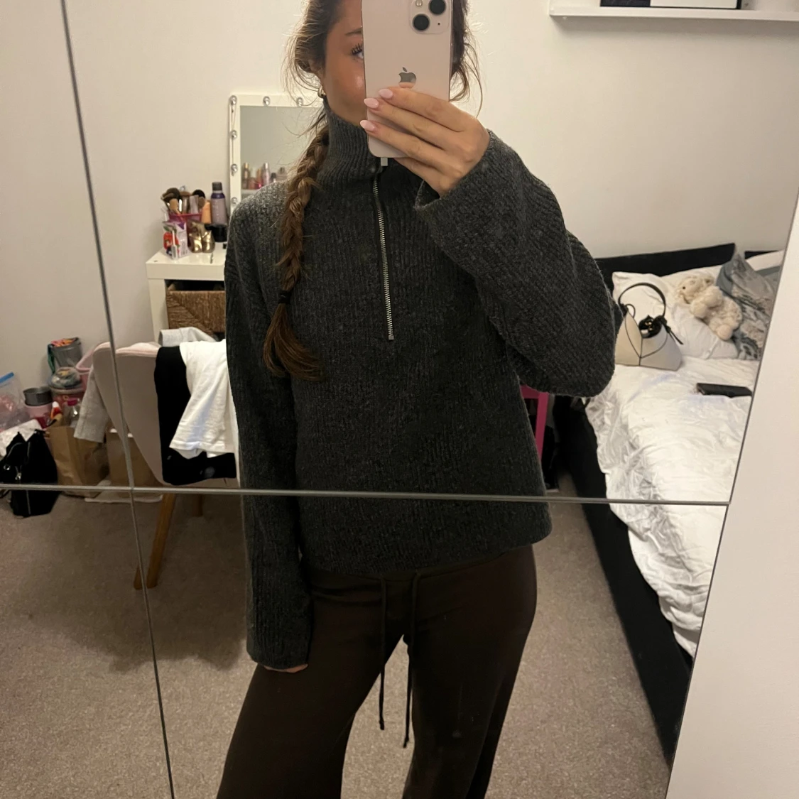 Säljer en mörkgrå stickad tröja med half zip-dragkedja i halsen. Perfekt nu till hösten! Strl xs men passar även S/M