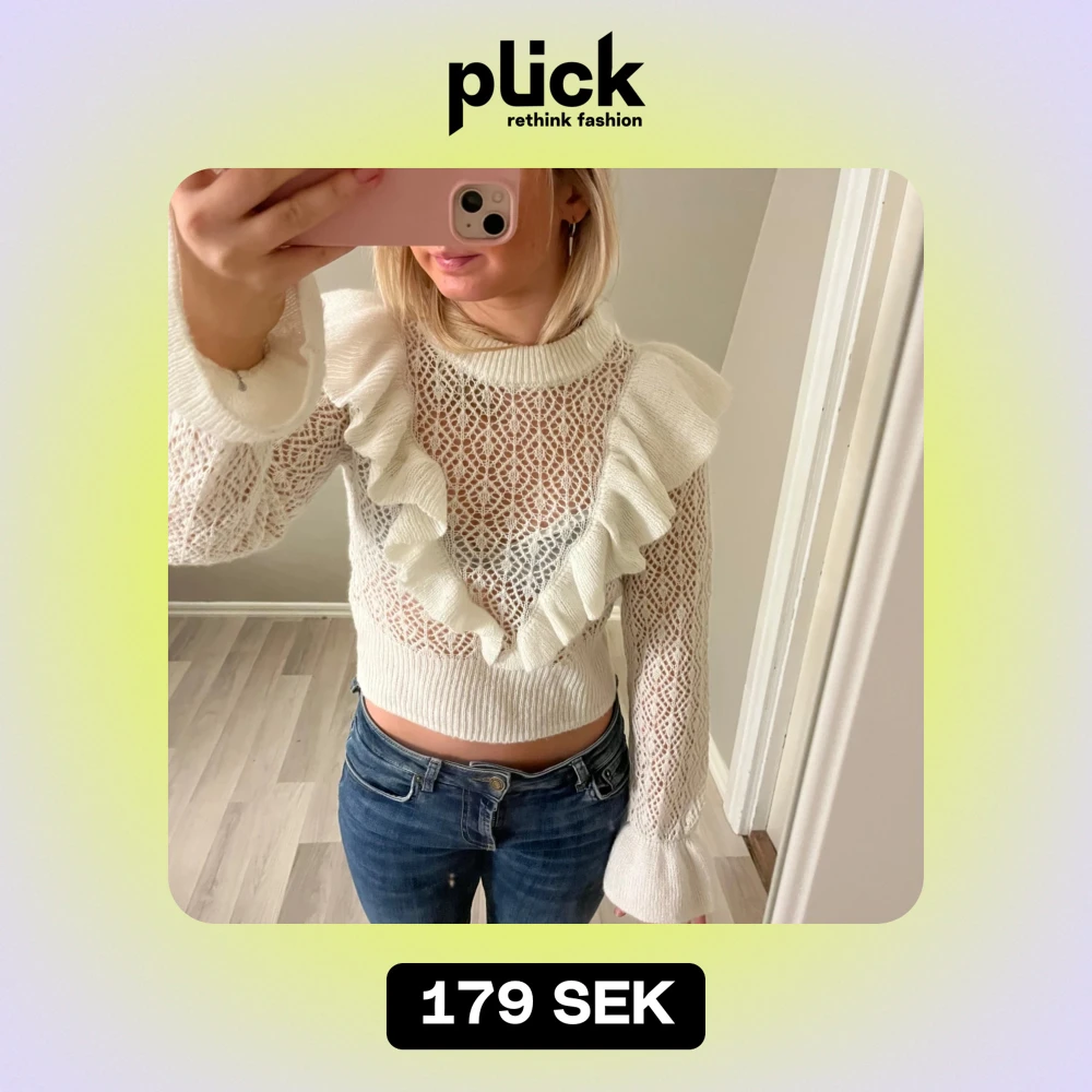 Säljer en superfin vit stickad tröja med volangdetaljer framtill o baktill. Säljer den då jag inte använder den längre.