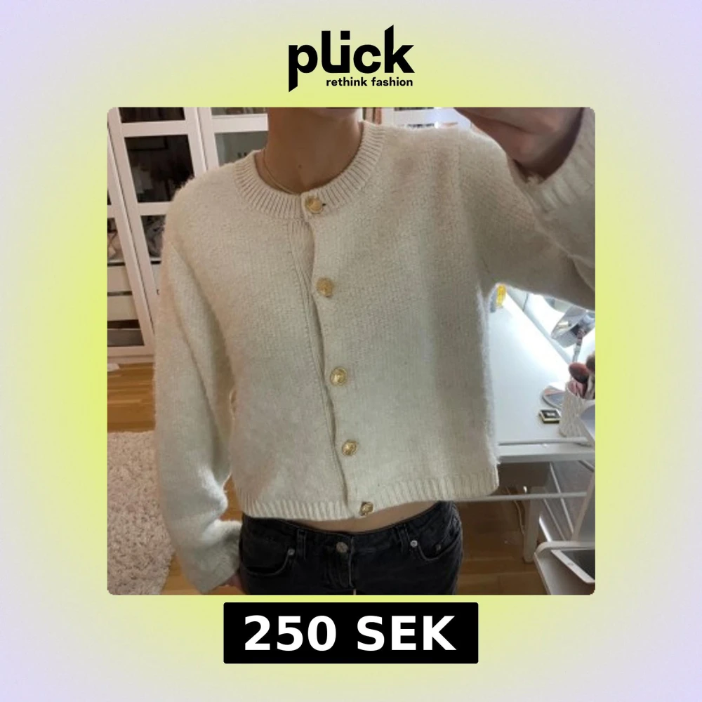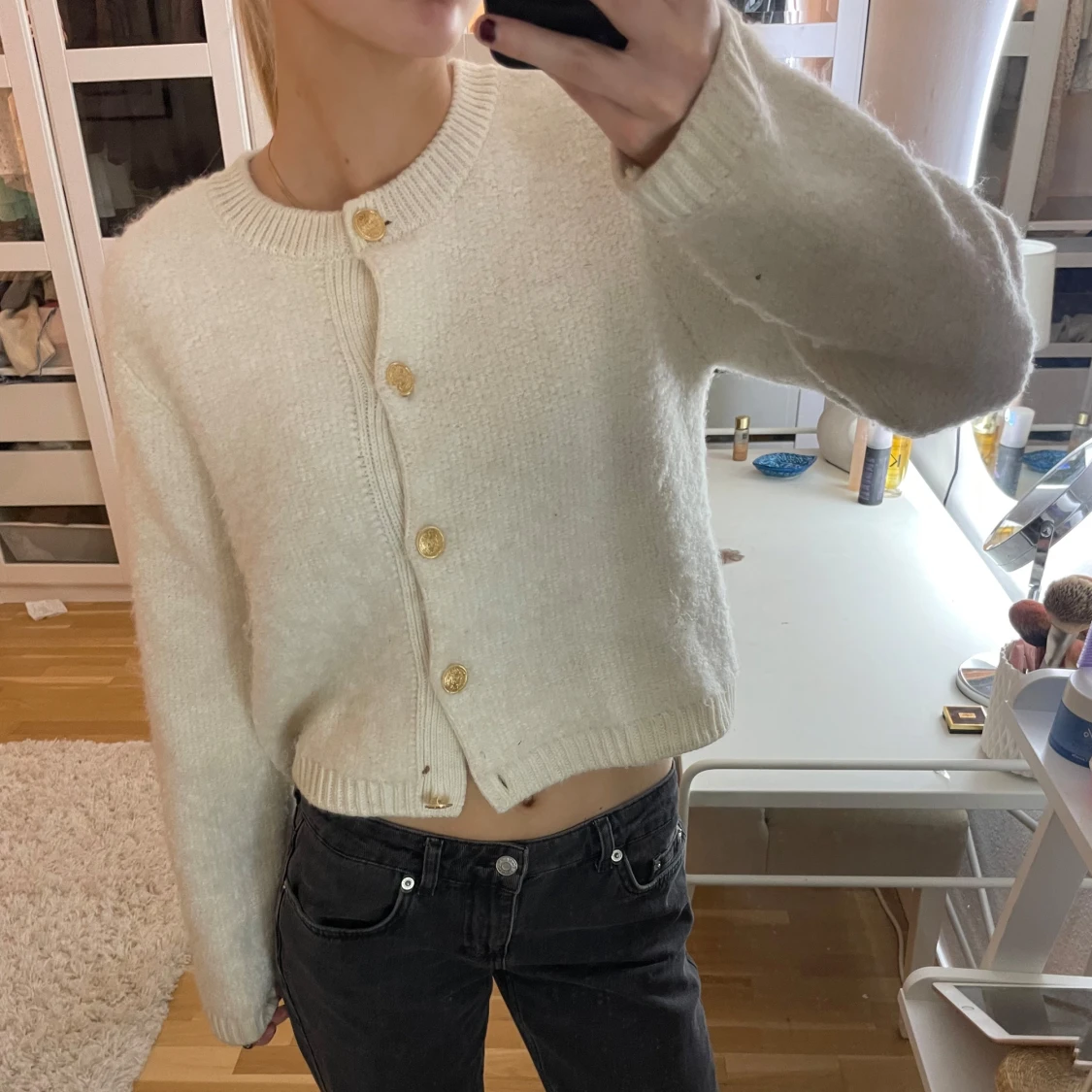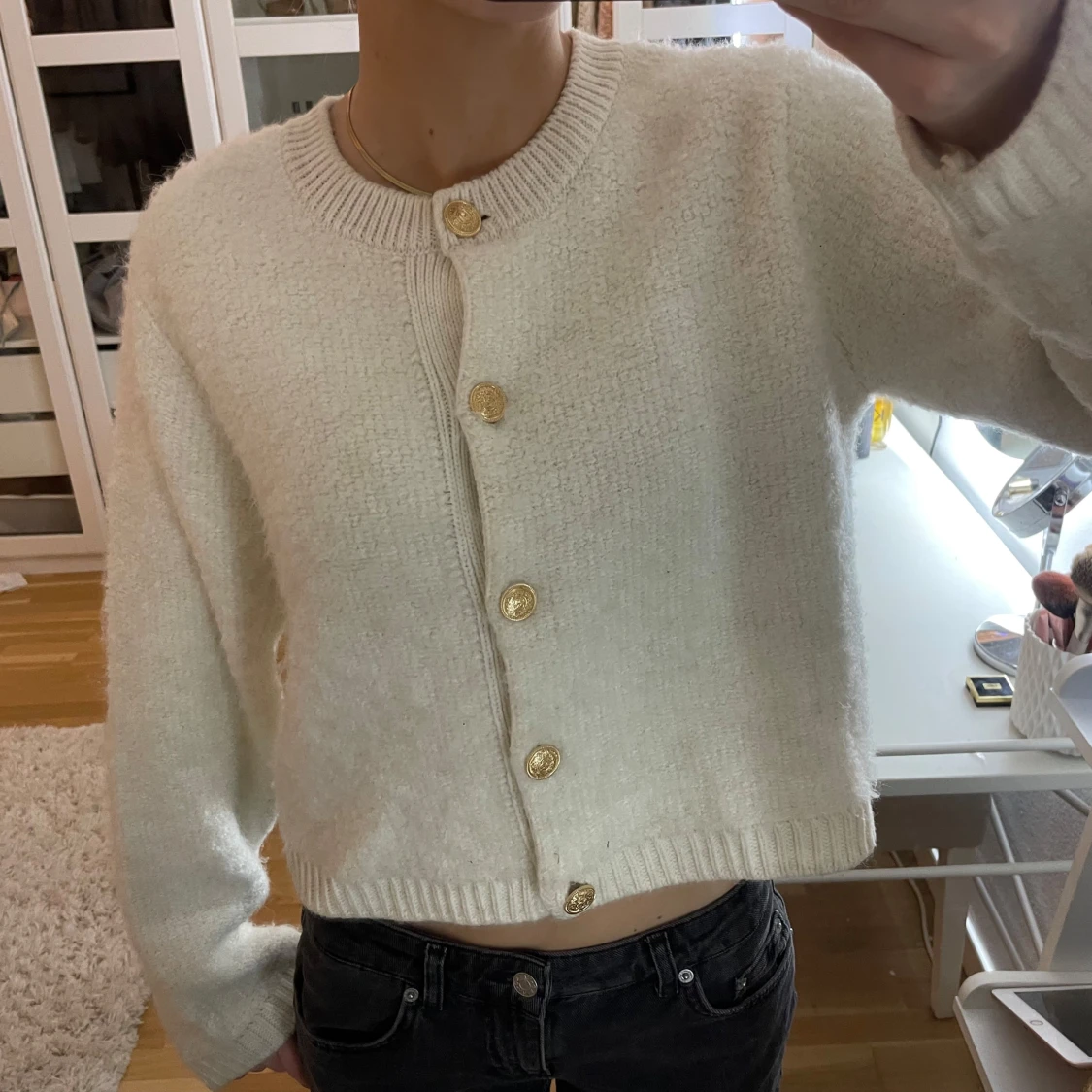 SĂ€ljer en vit stickad kofta med guldknappar!đ©·đ„°