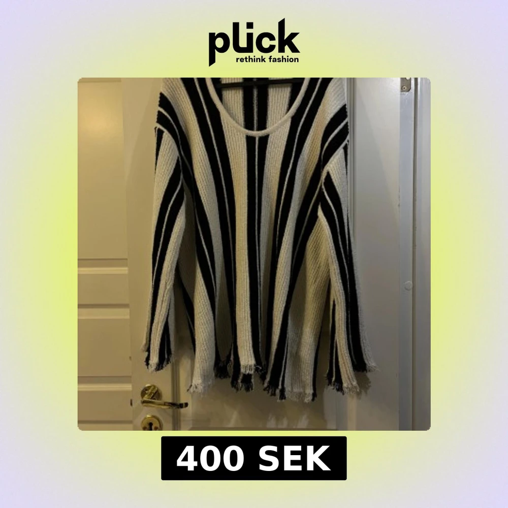 Säljer en svartvit randig stickad tröja med långa ärmar och fransdetaljer vid ärmslut och nederkant. Tröjan har en loose passform och är perfekt för en avslappnad stil. Den är ribbad och har en rund halsringning. Kjolen som är med är lång och sitter perfekt