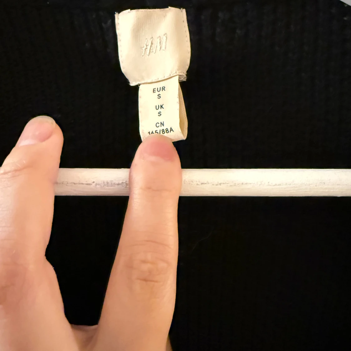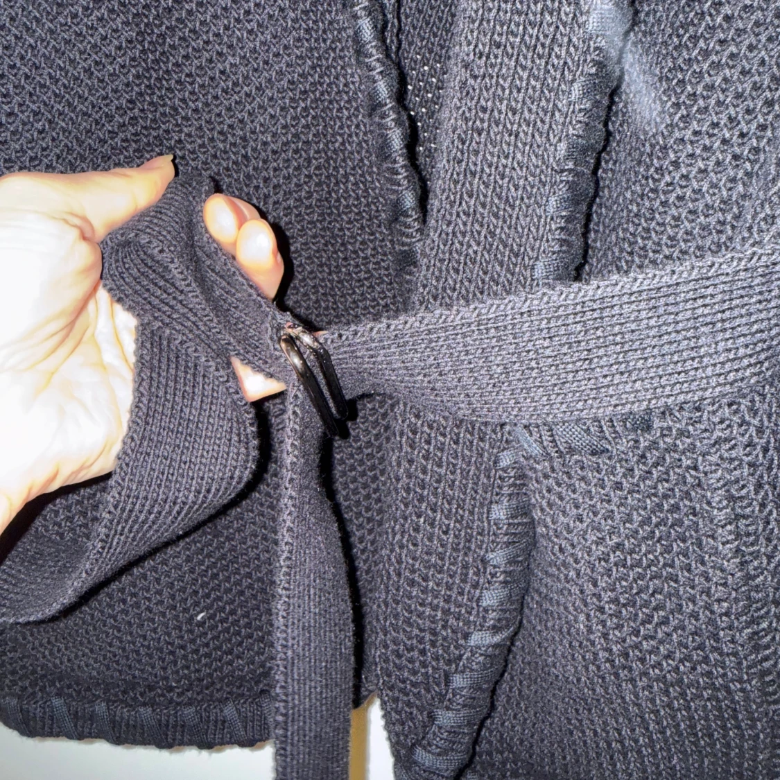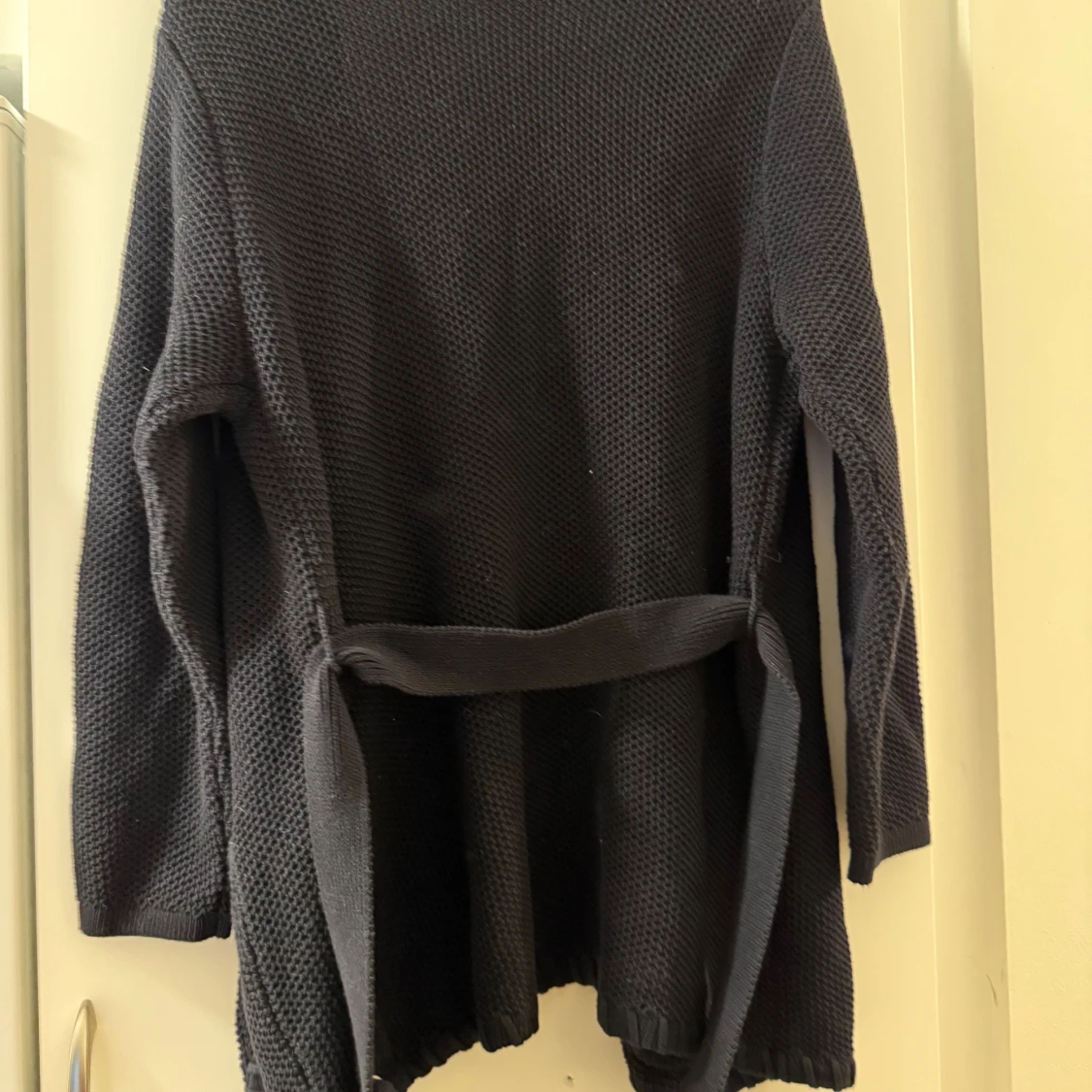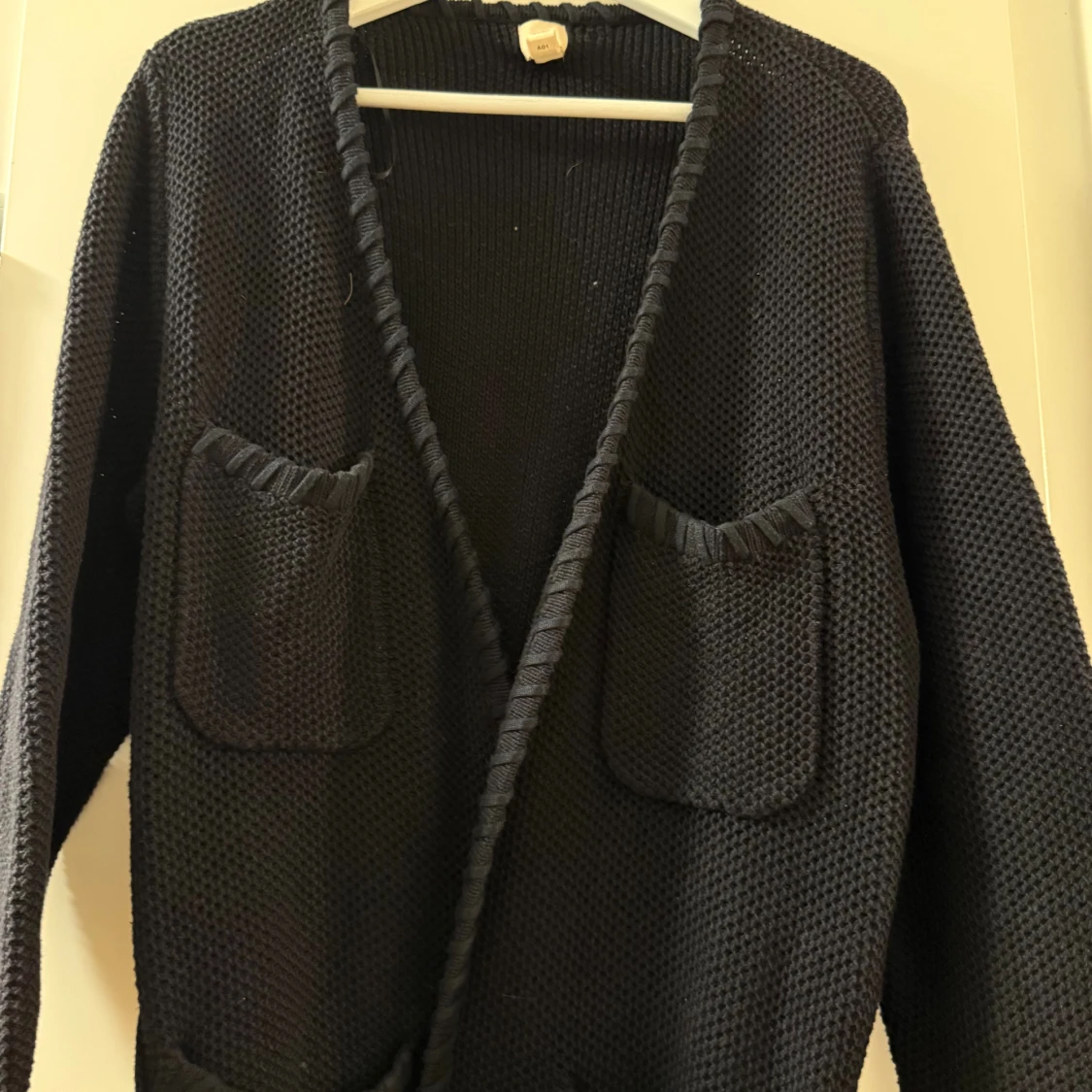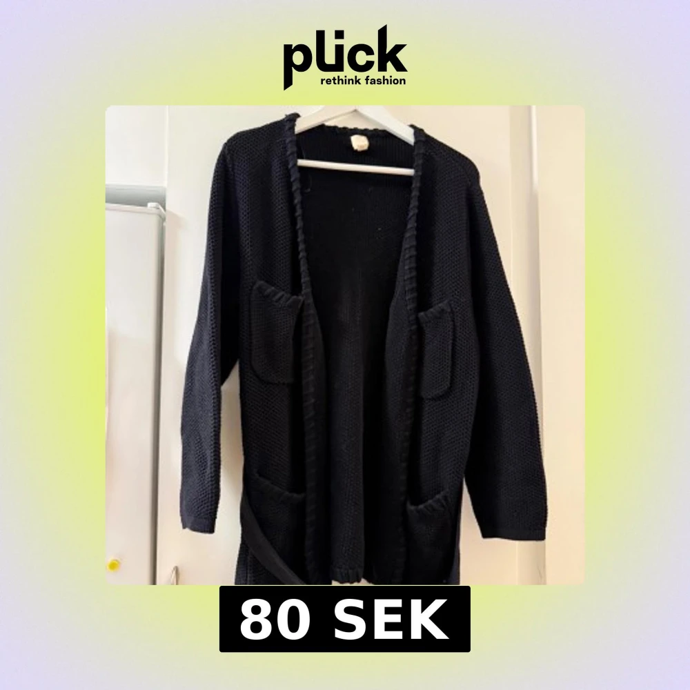 Svart stickad kofta från H&M med långa ärmar, två stora fickor framtill och ett matchande bälte i midjan. Koftan har en grovstickad struktur och ribbade kanter längs öppningen. Perfekt för lager-på-lager och chill vibes.