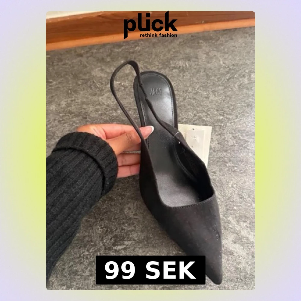 Stilrena svarta pumps från H&M med spetsig tå och smal klack. Skorna har en öppen häl med rem och är tillverkade i syntetmaterial med mockakänsla. Perfekta för dig som vill ha en clean och trendig look.