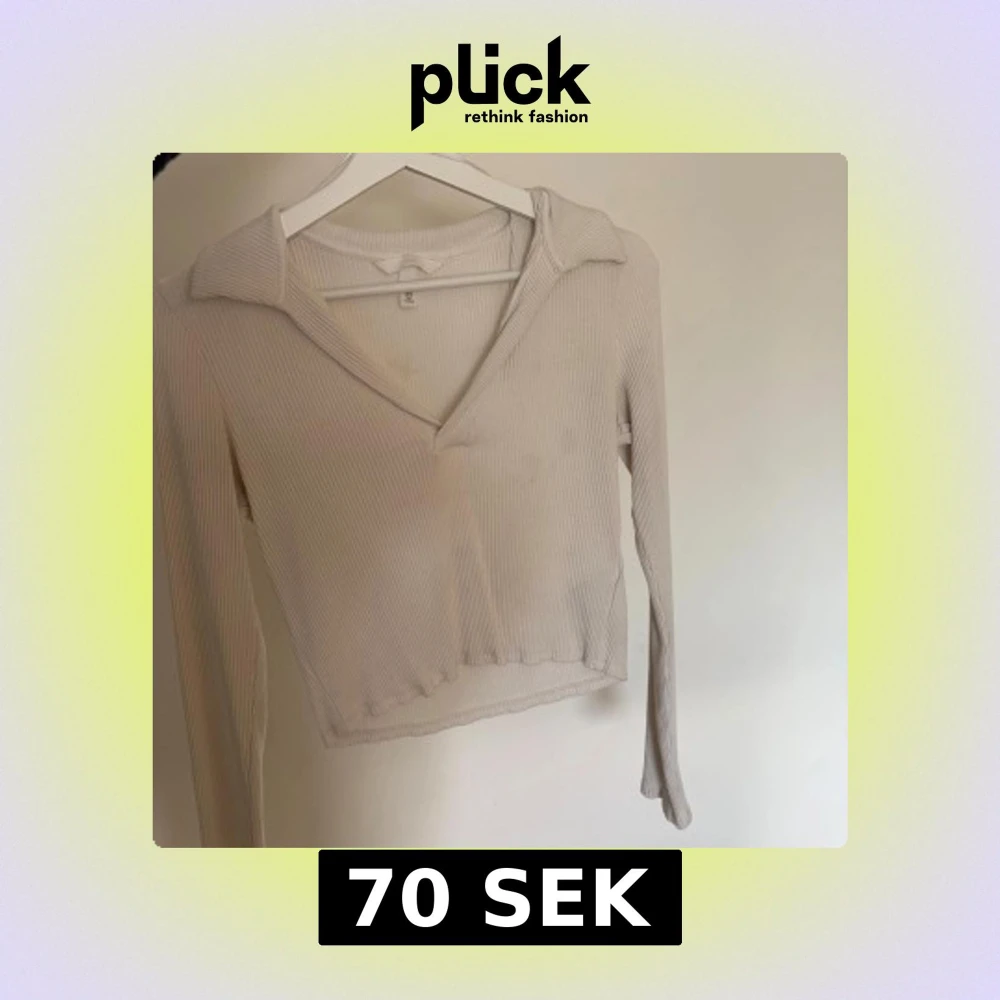 Säljer en beige ribbad croppad tröja med krage och v-ringning. Tröjan har långa ärmar och är perfekt för en trendig och avslappnad stil. Passar dig som gillar stilrena basplagg med en twist.