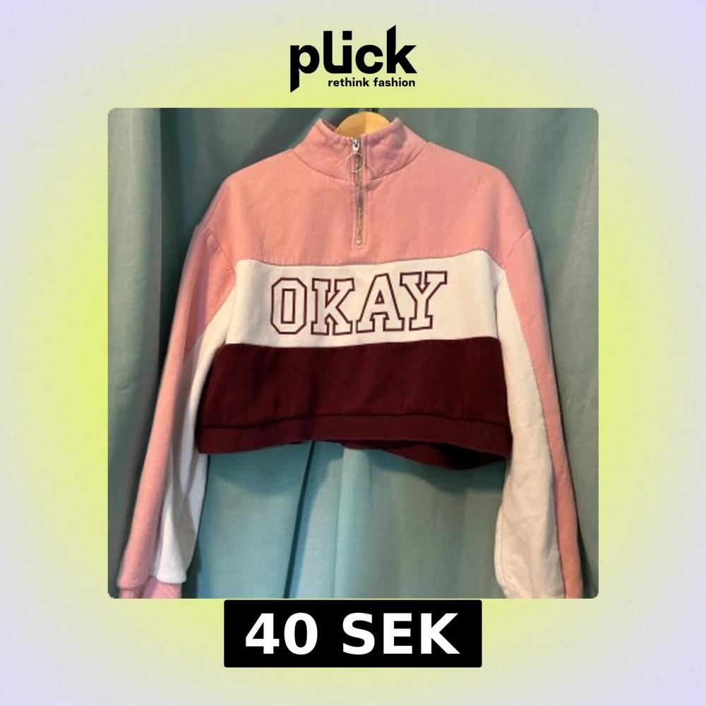 Snygg croppad tröja i rosa, vitt och vinrött med texten 'OKAY' framtill. Tröjan har lång ärm, half zip med ring och hög krage. Perfekt för dig som gillar sportig och trendig stil.
