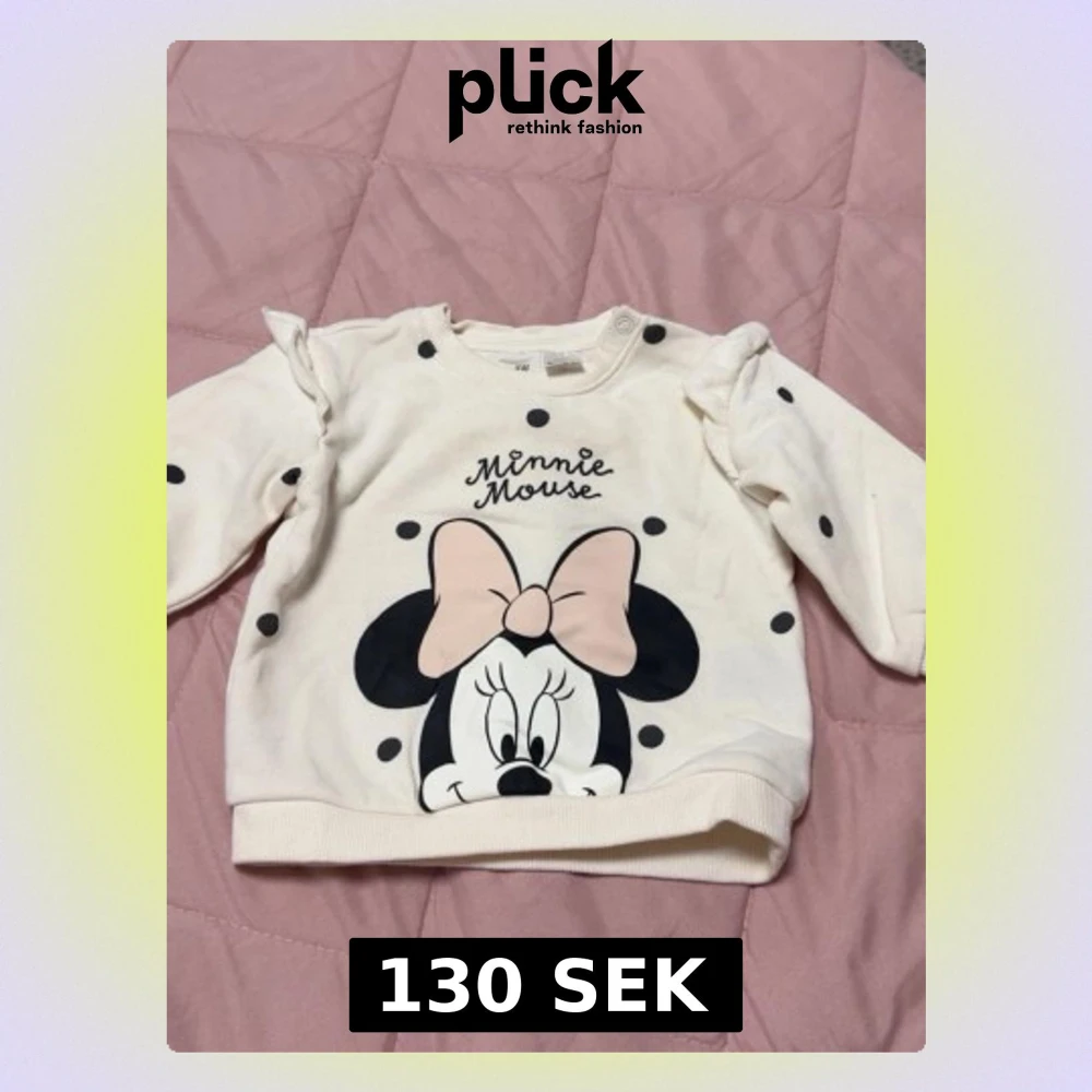 Söt vit sweatshirt med svarta prickar och stort tryck av Minnie Mouse framtill. Tröjan har volangdetaljer vid axlarna och en ljusrosa rosett på Minnie. Rund halsringning och långa ärmar. Perfekt för dig som gillar Disney och vill ha en lekfull stil.