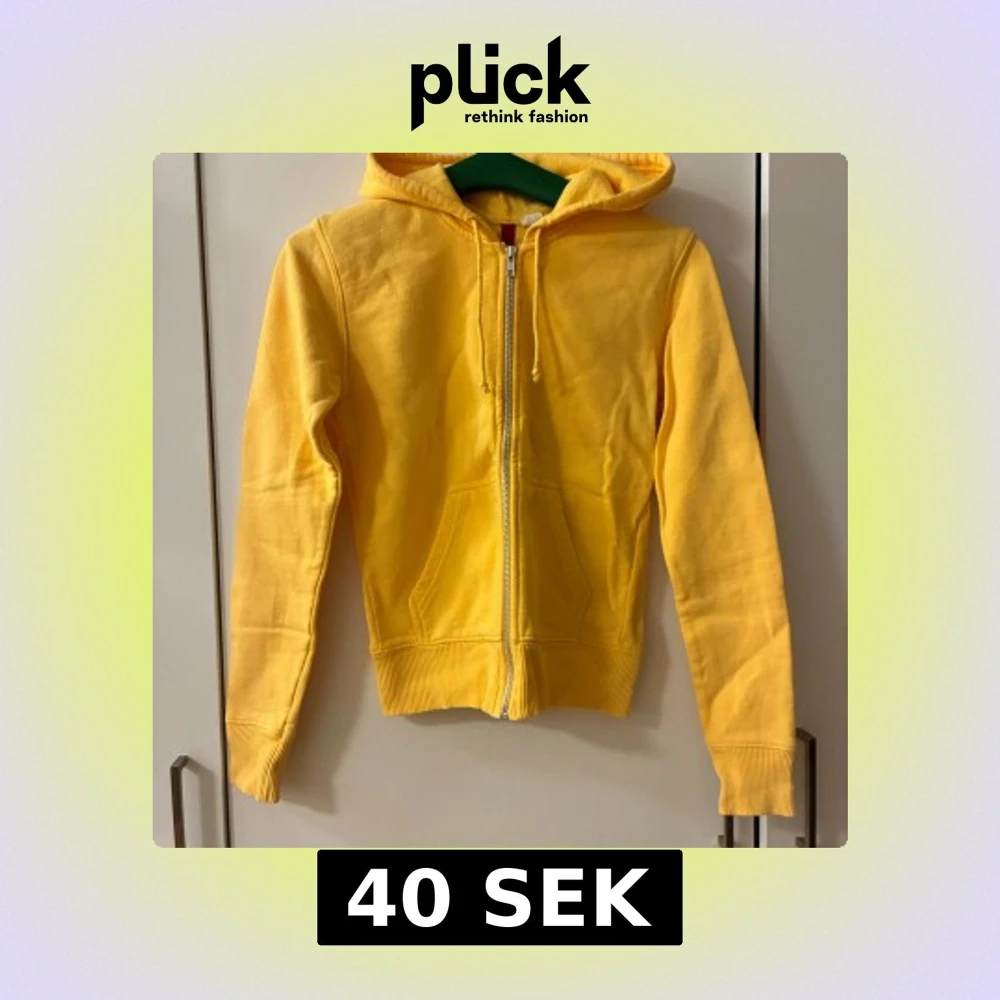 Gul hoodie med huva och hel dragkedja framtill. Tröjan har två fickor och ribbade muddar vid ärmslut och nederkant. Tillverkad i 100% bomull, perfekt för dig som gillar färgglada och bekväma plagg. Uppskattar att storleken är 36 i europeiskt mått.