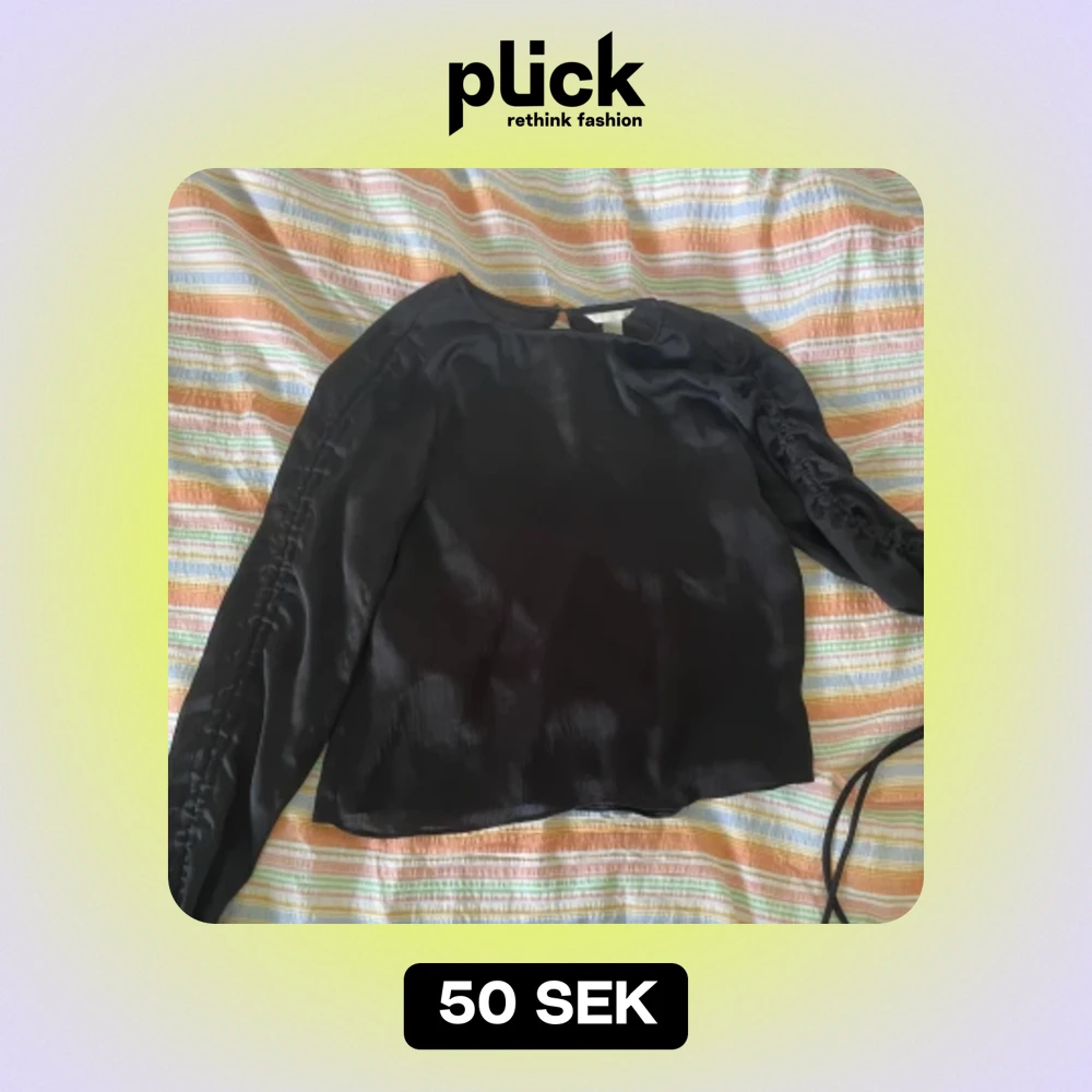 En elegant svart blus från H&M med långa ärmar och en glansig finish. Blusen har en enkel design med en lös passform och är tillverkad i ett lätt material.