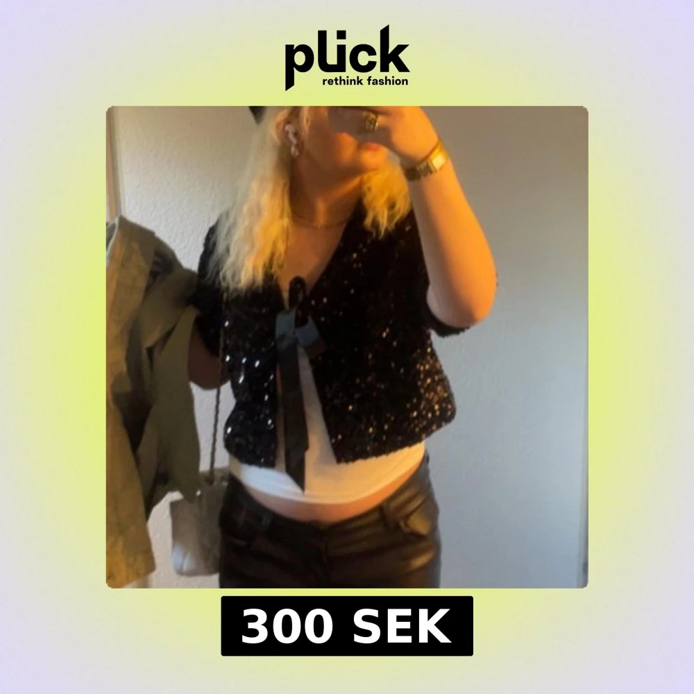 Säljer en svart, croppad kofta från H&M täckt med paljetter och med knytband framtill. Perfekt för att lyfta en outfit med lite extra glitter. Koftan har kortare passform och är i syntetmaterial.