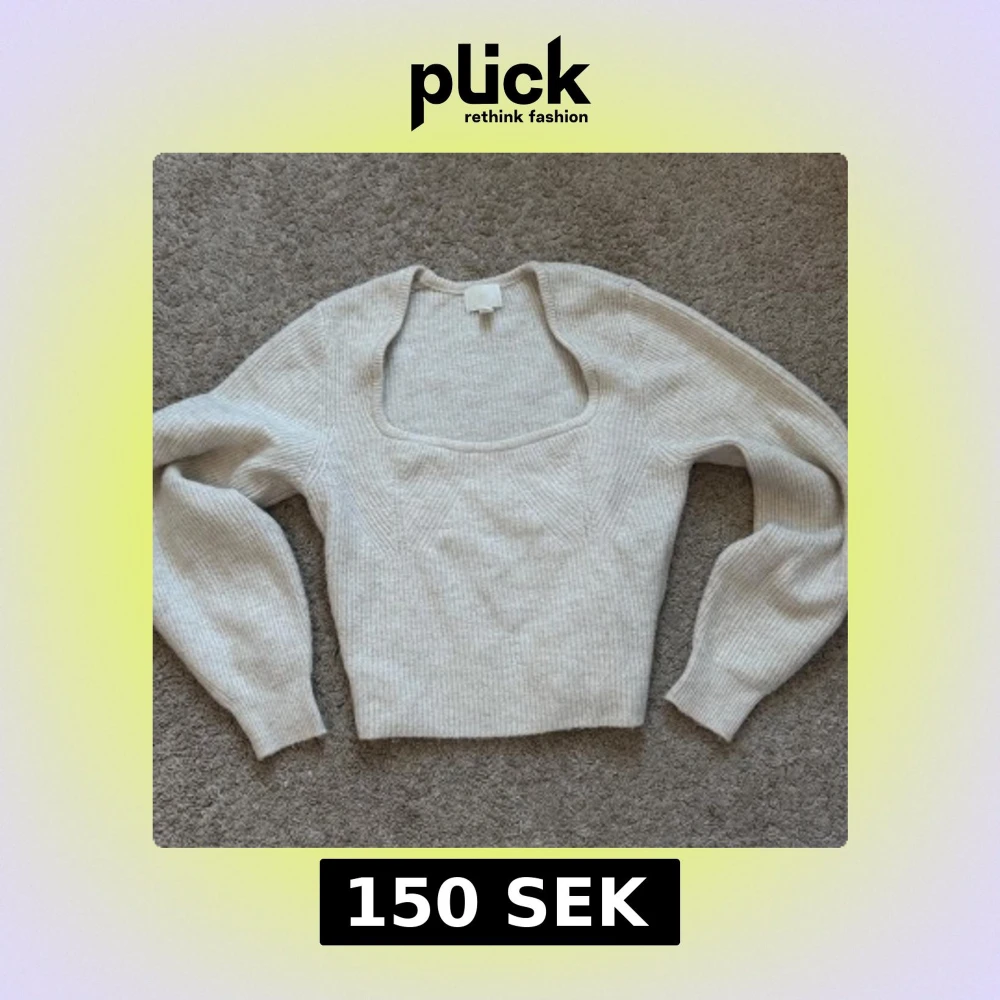 Säljer en stilren beige stickad tröja från H&M. Tröjan har en fyrkantig halsringning och långa ärmar, perfekt för kyligare dagar. Den ribbade strukturen ger en snygg och bekväm passform. Passar utmärkt till både jeans och kjol.
