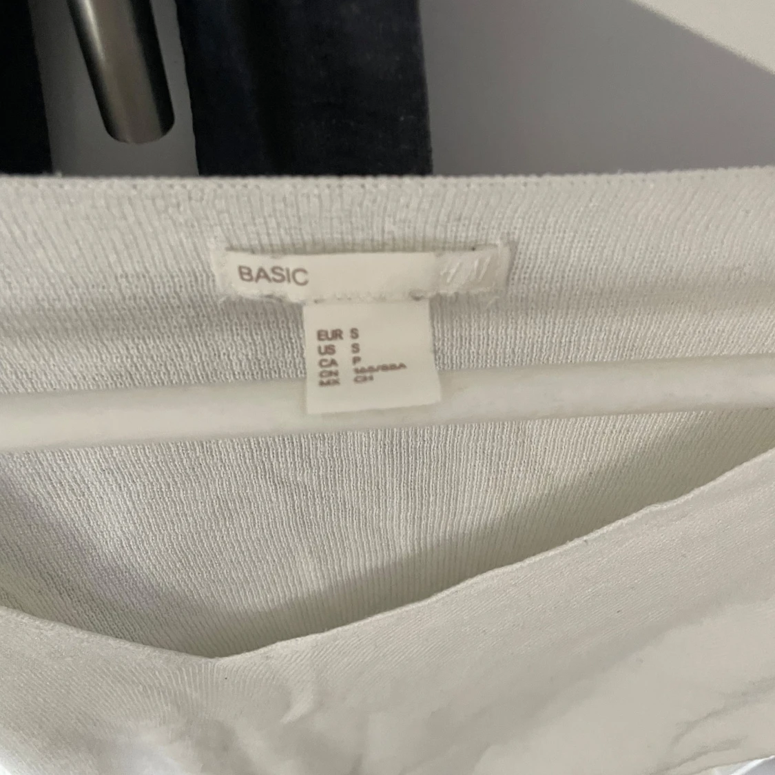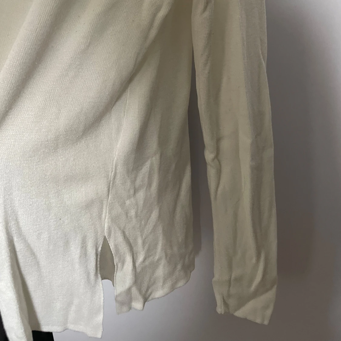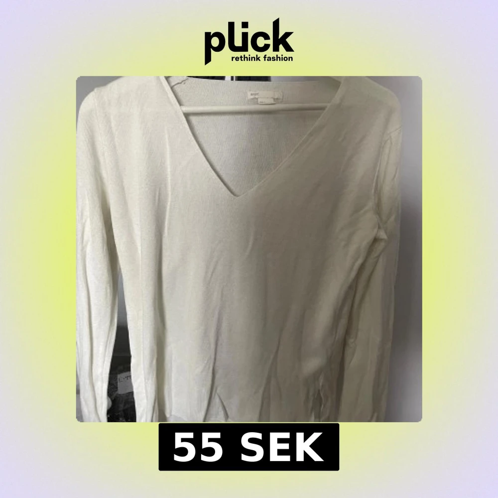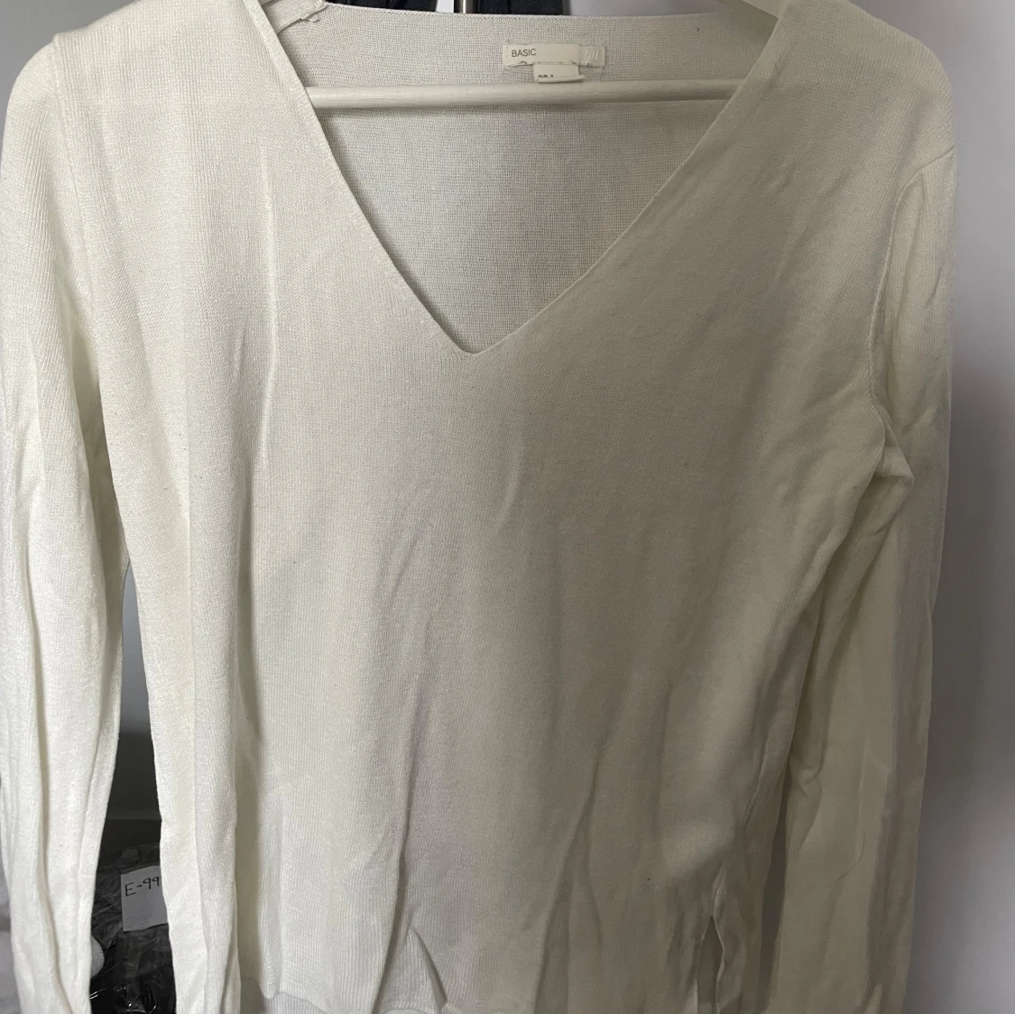 Vit stickad tröja från BASIC med v-ringning och långa ärmar. Tröjan har en enkel och stilren design med små slitsar i sidorna. Perfekt för lager-på-lager och passar till många olika outfits.