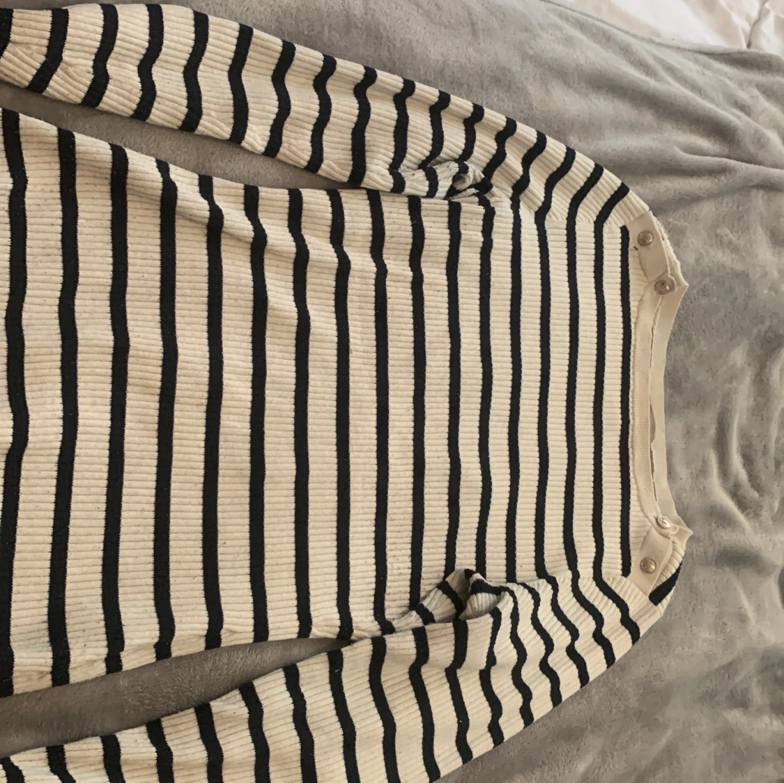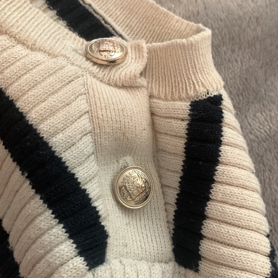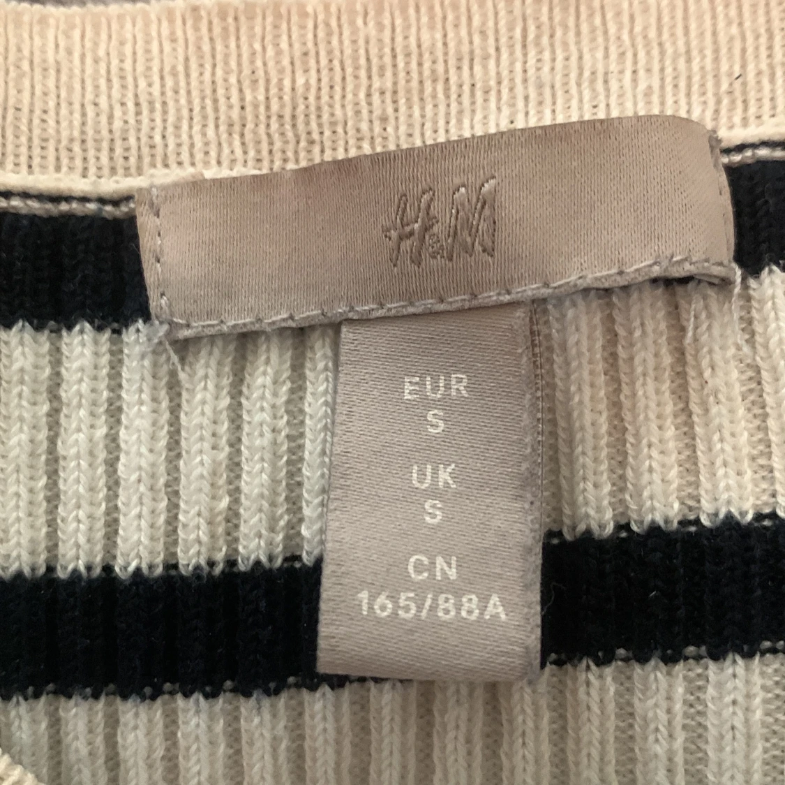 Säljer en ribbad långärmad tröja från H&M i beige och svart med horisontella ränder. Tröjan har dekorativa silver knappar vid axeln och är i ett stretchigt material. Perfekt för dig som gillar klassisk stil med en twist.