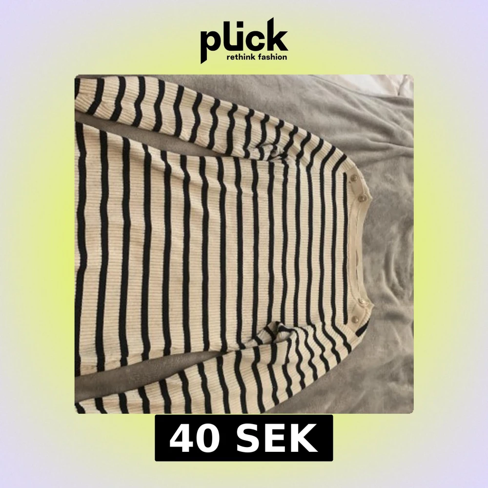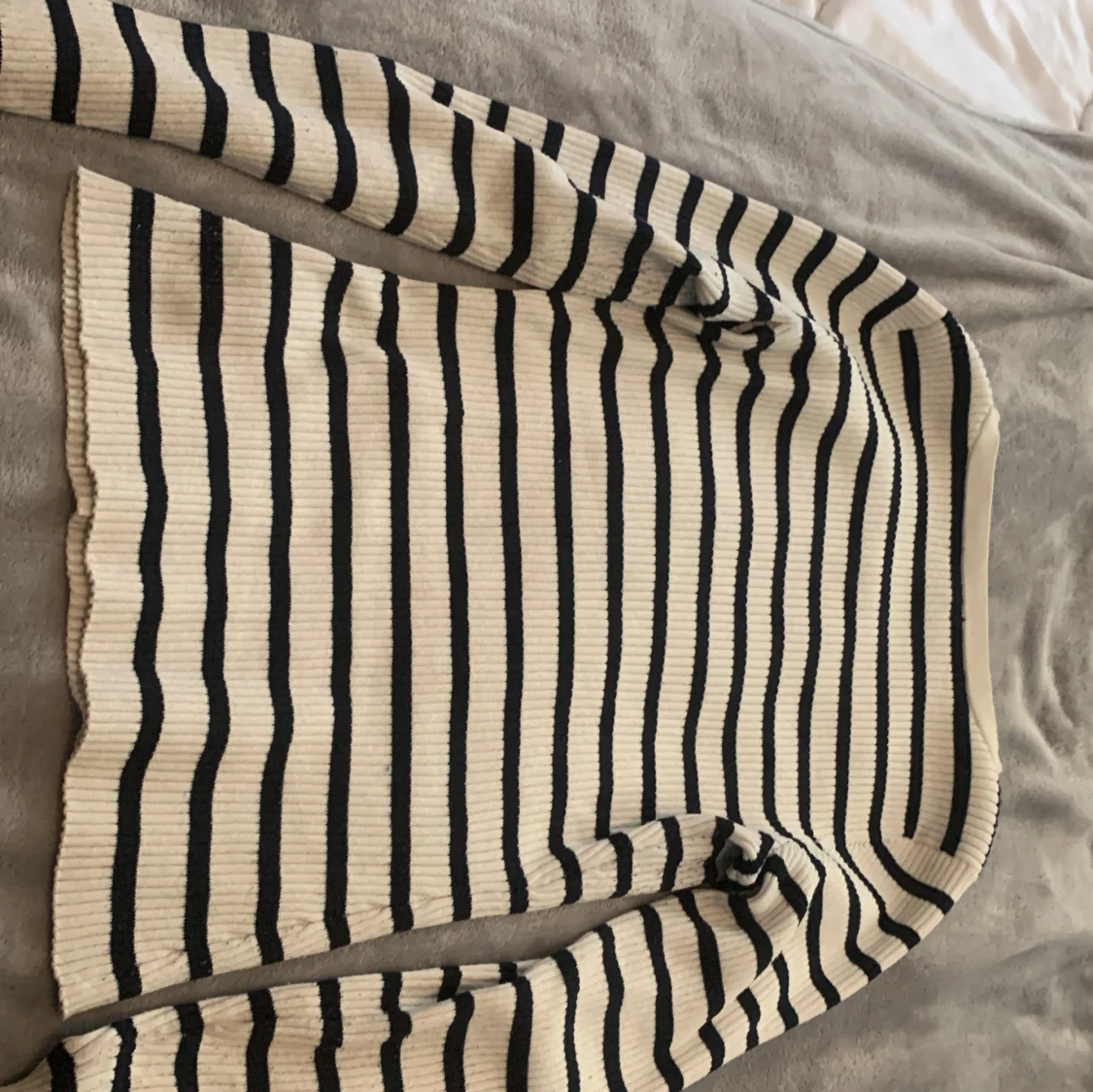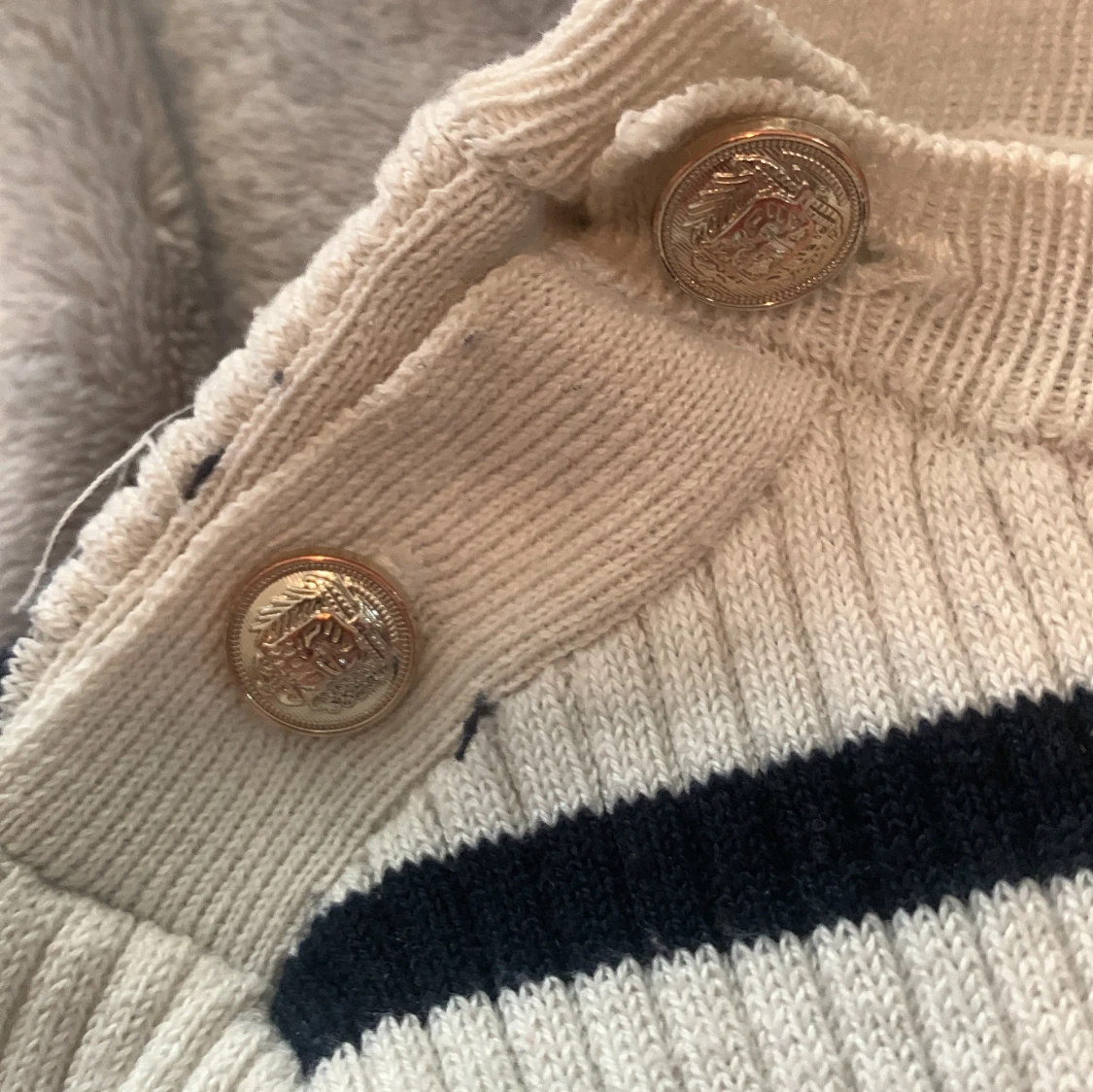 Säljer en ribbad långärmad tröja från H&M i beige och svart med horisontella ränder. Tröjan har dekorativa silver knappar vid axeln och är i ett stretchigt material. Perfekt för dig som gillar klassisk stil med en twist.
