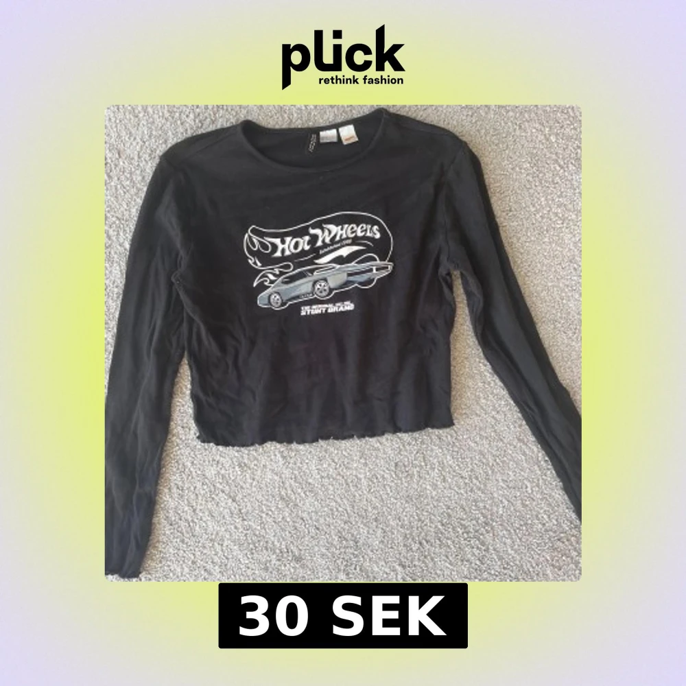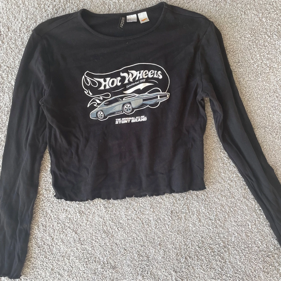 Säljer en cool svart långärmad tröja från Hot Wheels med ett tryck av en bil och logotyp på framsidan. Tröjan är croppad och har en avslappnad passform. Perfekt för dig som gillar en unik stil!