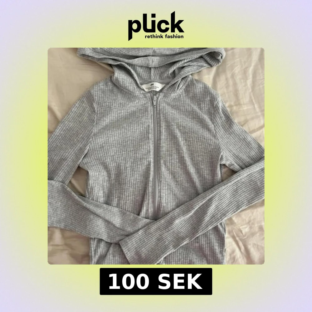 Säljer en grå ribbad tröja från H&M i storlek XS. Den har dragkedja framtill, huva och långa ärmar. Perfekt för en avslappnad stil och enkel att matcha med andra plagg, funkar även som överdrags plagg till gymmet!