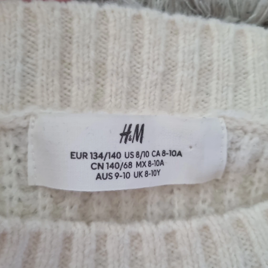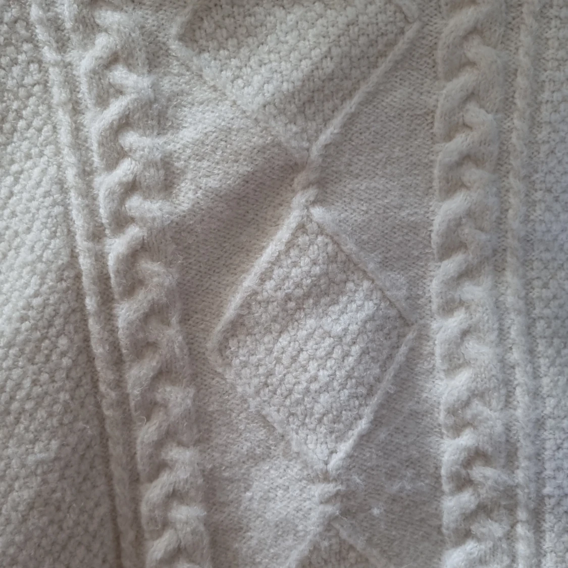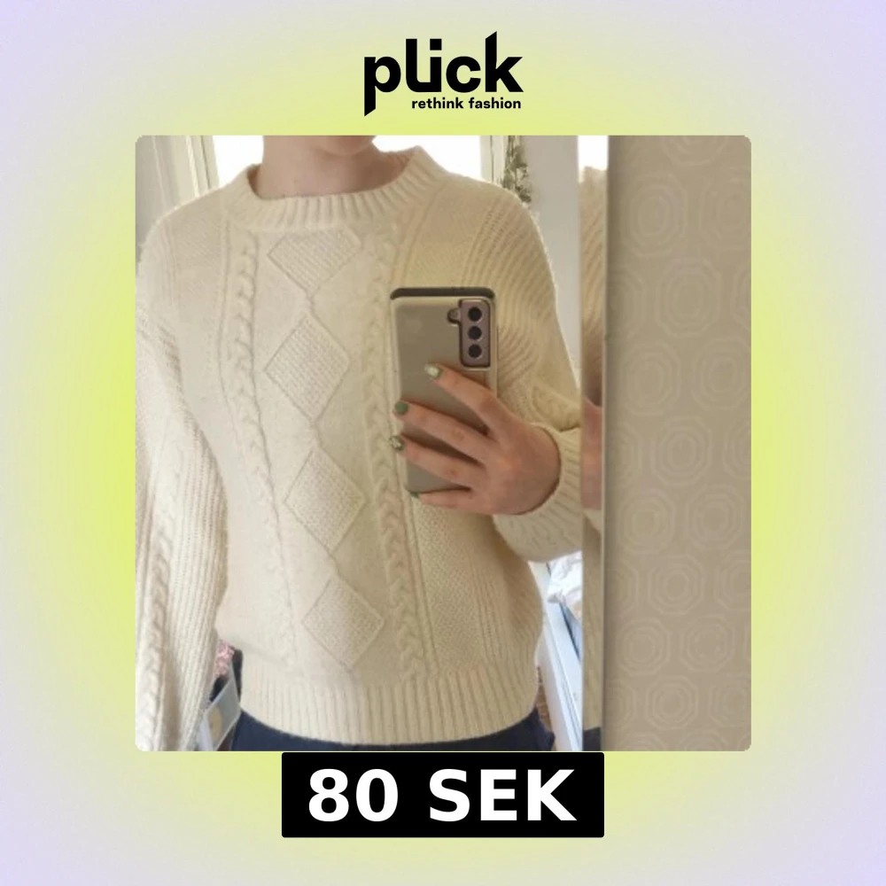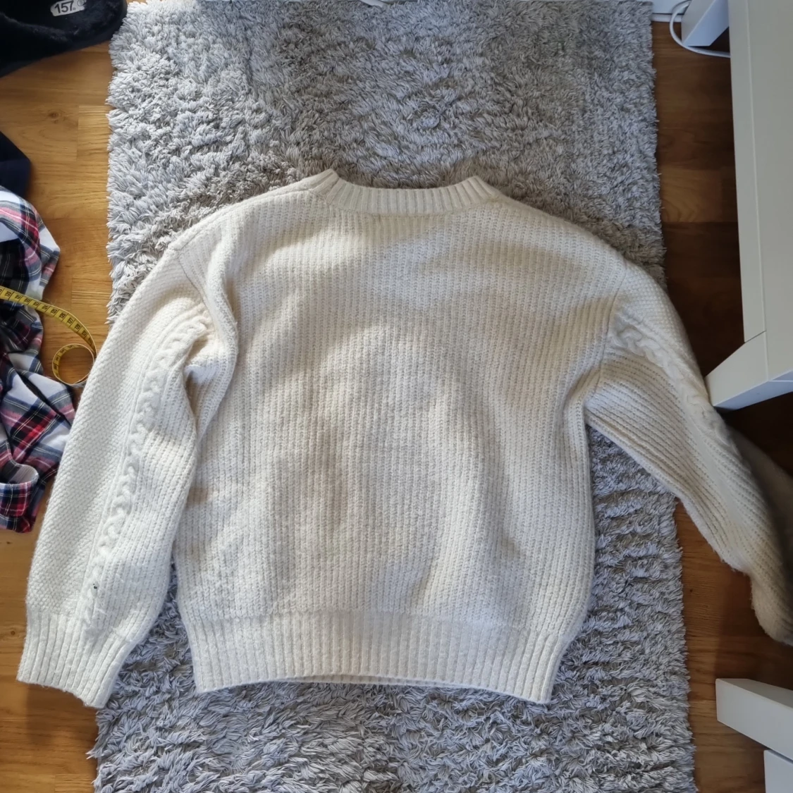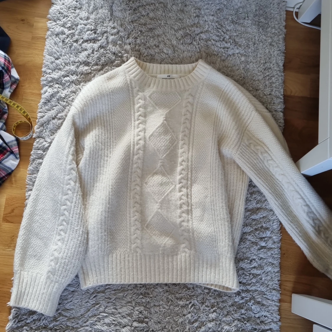 Säljer en krämvit stickad tröja från H&M med klassiskt kabelstickat mönster och diamantdetaljer framtill. Tröjan har rund halsringning, långa ärmar och breda ribbade muddar vid ärmslut och nederkant. Perfekt för kyliga dagar!Har användit några gånger men i nyskick. Frakt ingår inte. Säljer för att jag har växt ur dem.