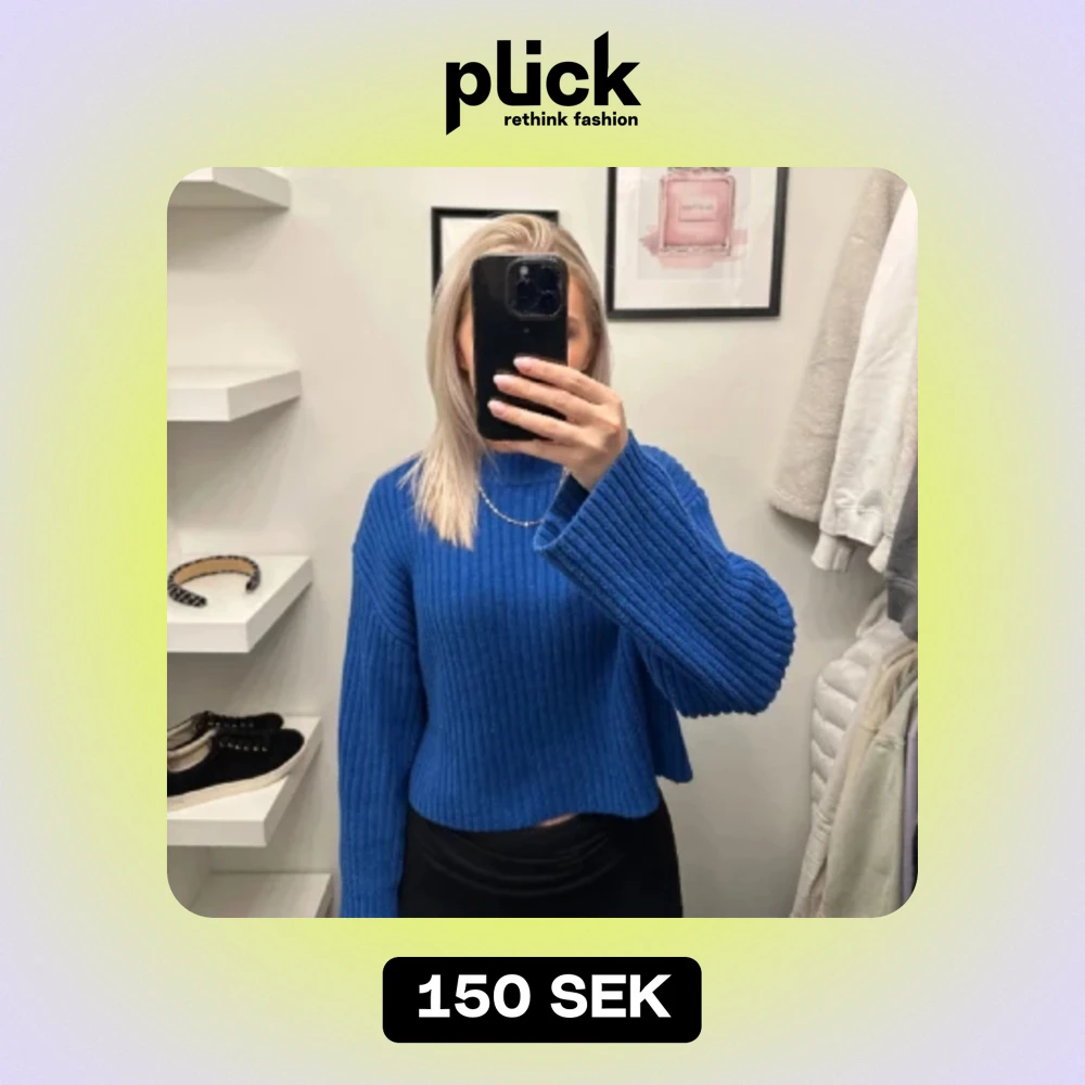 Säljer en superfin blå stickad tröja med ribbad struktur. Den är croppad och har långa ärmar.