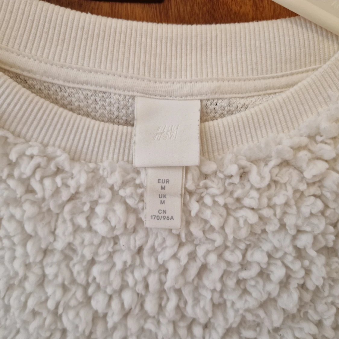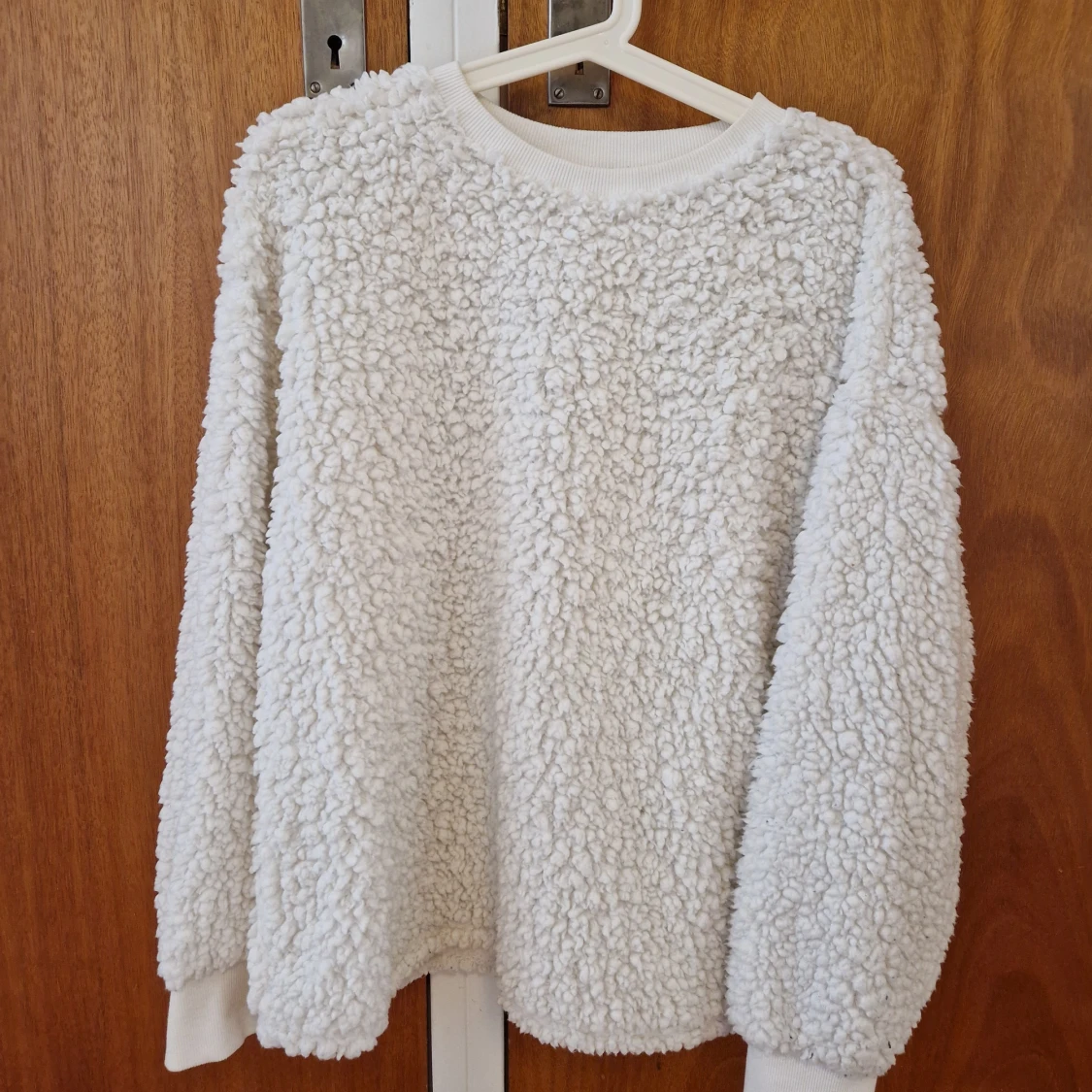 På insidan av tröjan har det fastnat lite svarta tygnoppor annars är den i jättefint skick. Rymlig i storleken. Fluffig och riktig mysig tröja!