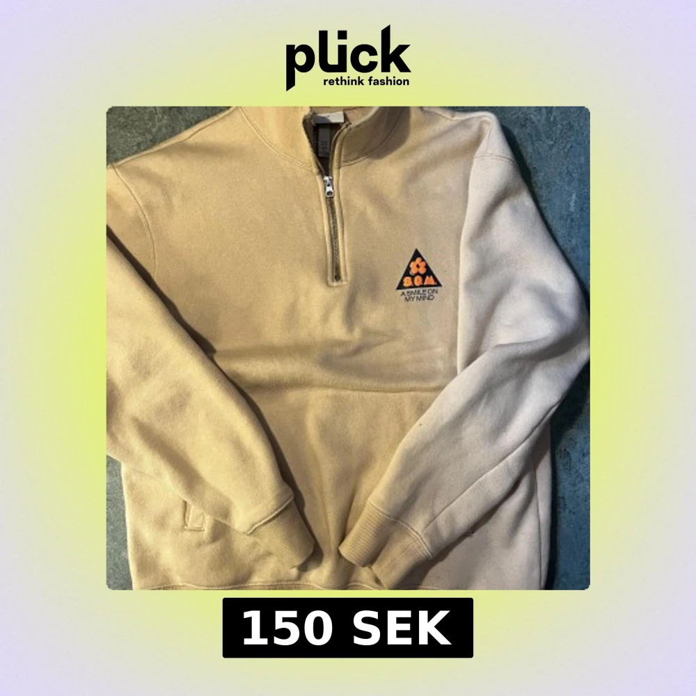 Beige sweatshirt från H&M med half zip och broderad detalj på bröstet med texten 'A Smile On My Mind' och en orange blomma. Tröjan har hög krage, långa ärmar och mjukt material som känns skönt mot huden. Perfekt för chill dagar.