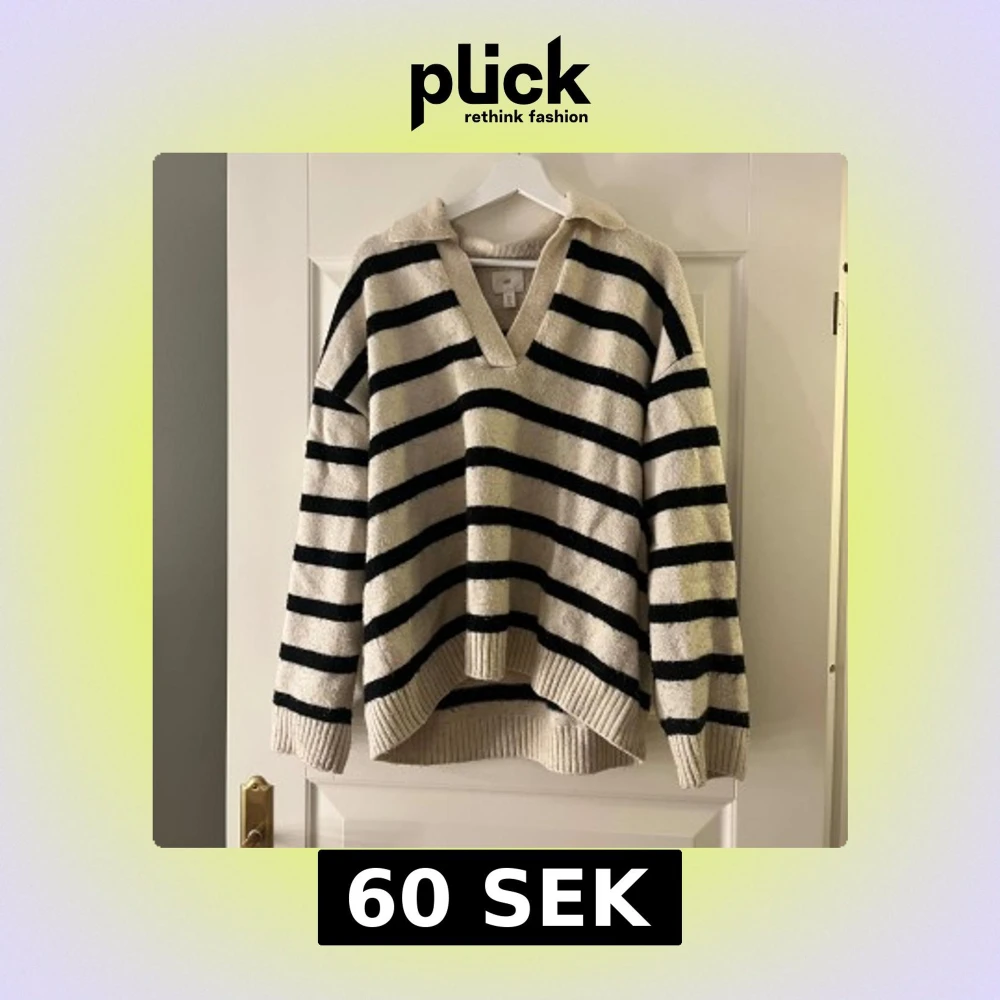 Säljer en mysig stickad tröja från H&M i beige och svart med randigt mönster. Tröjan har en v-ringad krage och långa ärmar, perfekt för kyligare dagar. Den har en avslappnad passform och ribbade kanter.