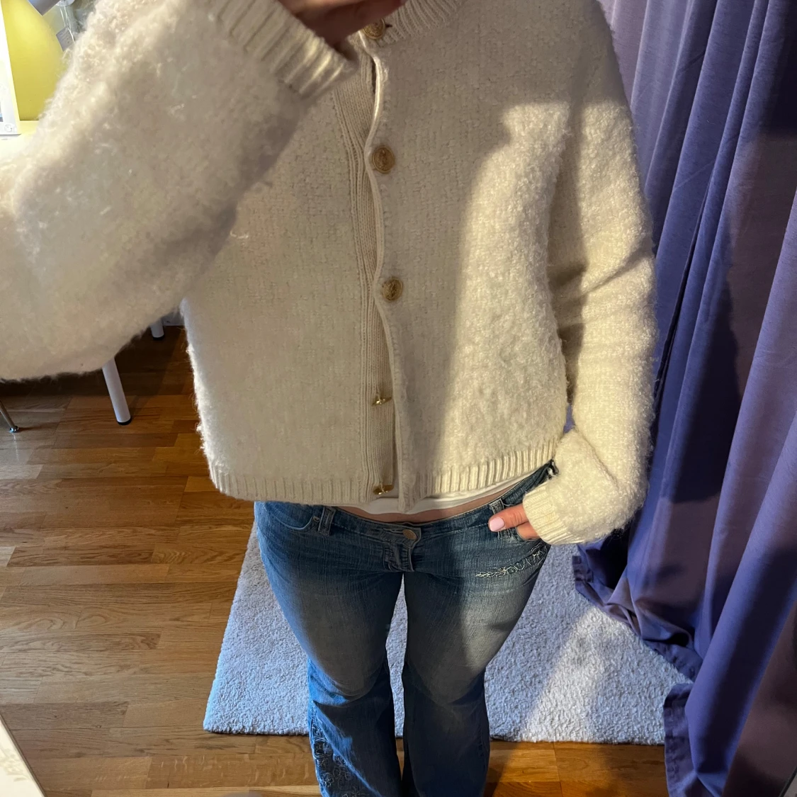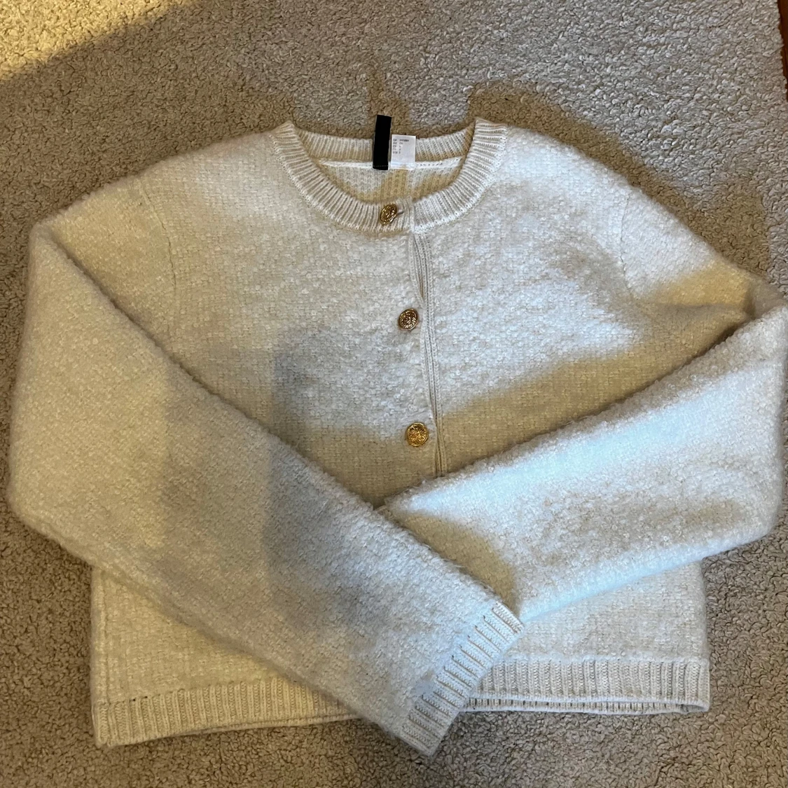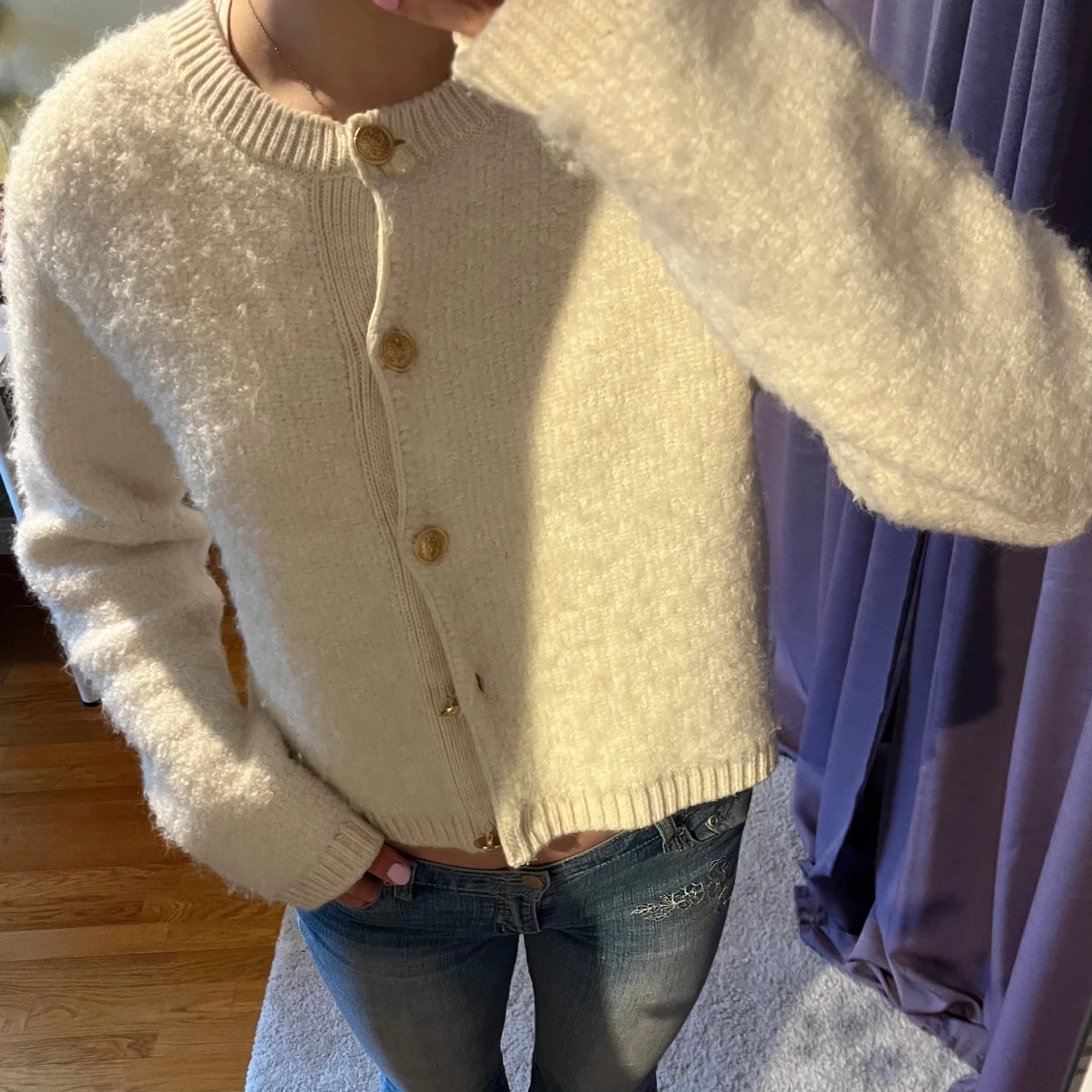 Mysig vit stickad kofta med träknappar framtill. Den har en rund halsringning och långa ärmar med ribbade muddar.